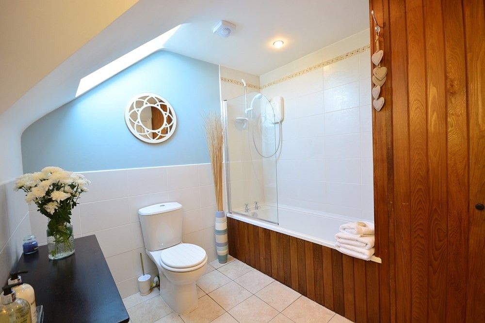 The sizeable bathroom has a bath with shower, sink, toilet and and dark wood panelling that compliments the light blue interiors.