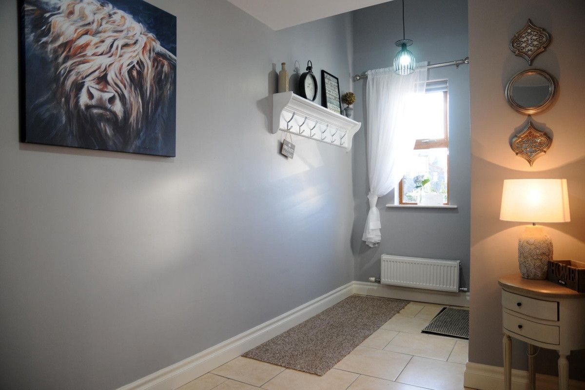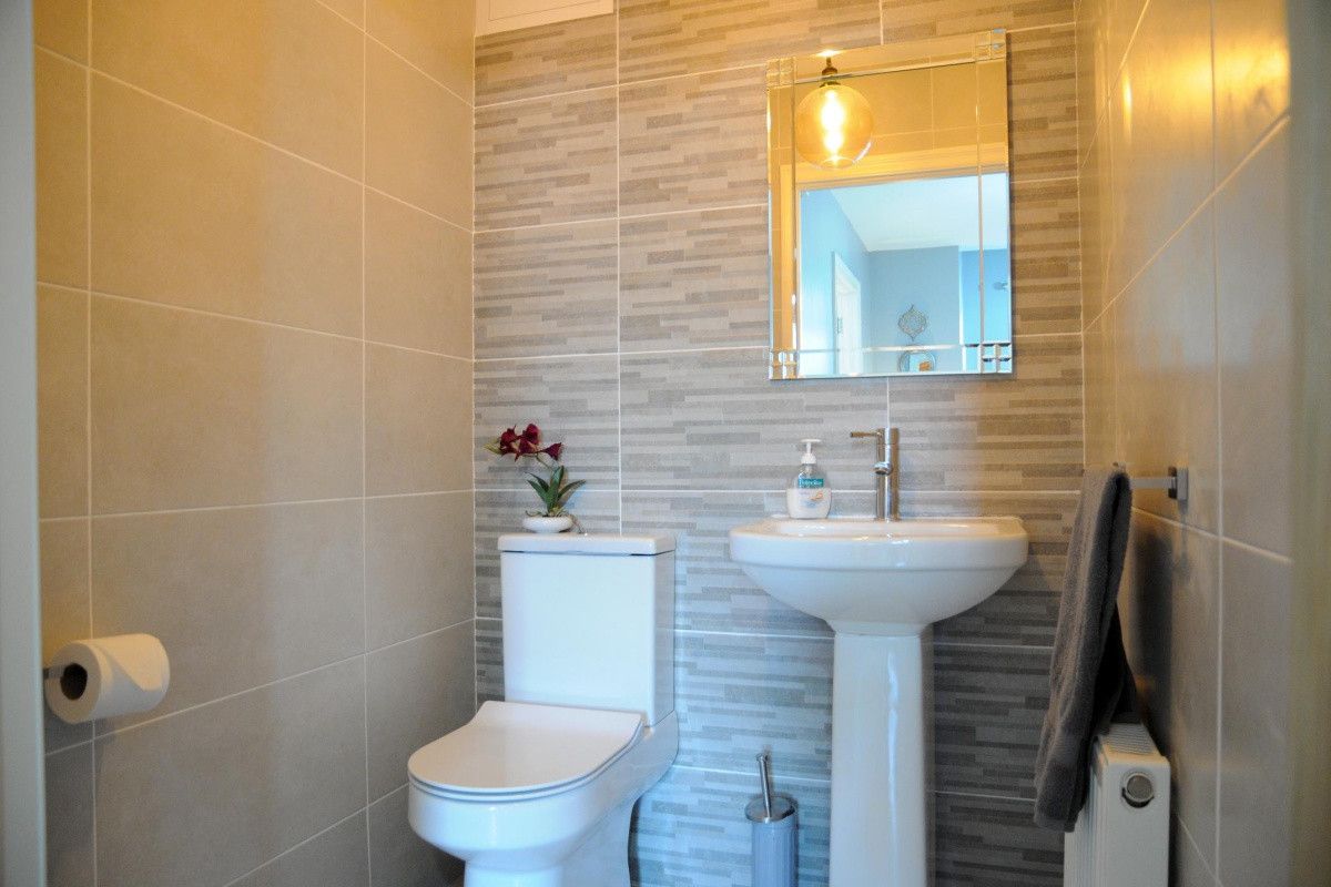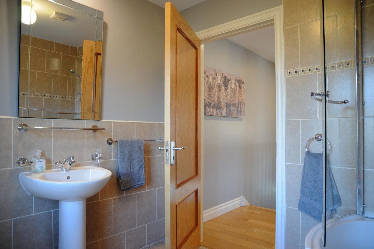 The spacious Kitchen/diner has lovely soft grey walls trimmed with white woodwork and a fresh, pearl grey modern kitchen including an island breakfast bar with two high backed stools matching the stylish dining suite. The kitchen stocks all your culinary needs with plenty storage and worktop space containing a built in fridge/freezer, dishwasher, microwave, electric oven and hob, kettle and toaster. This charming space is flooded with light due to three windows and a mirror surrounding the oak dining table for six, a large kitchen window over the sink and french doors leading out onto the garden.
