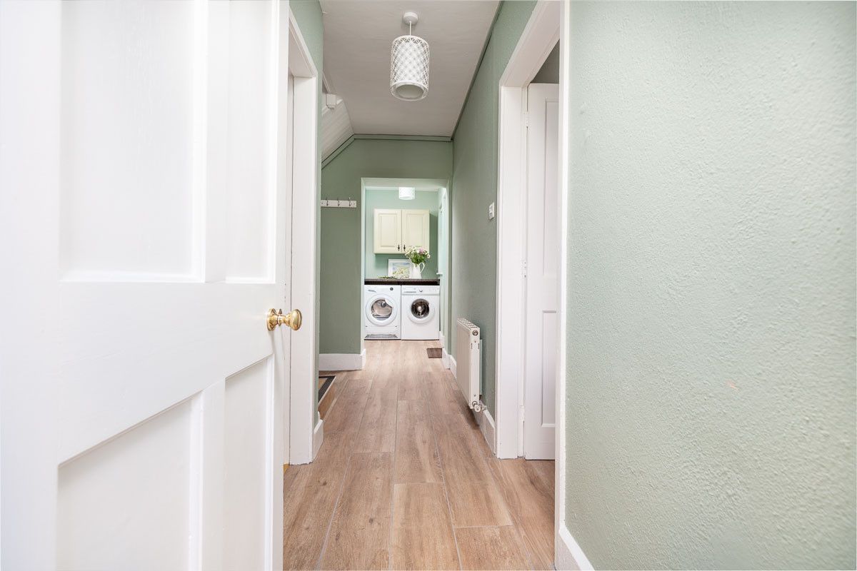 The utility area has a washing machine and drier. Extra storage room and coat hooks are next to and under the stairs in the hallway.