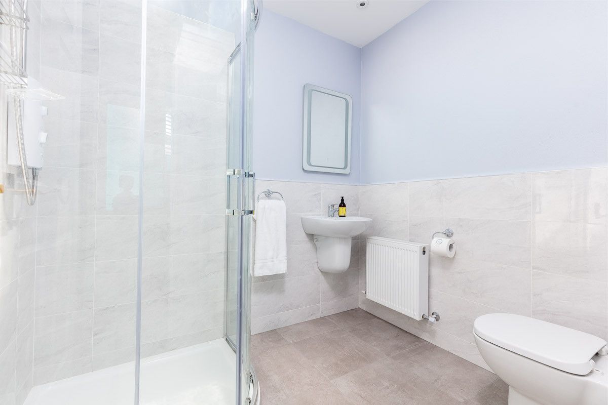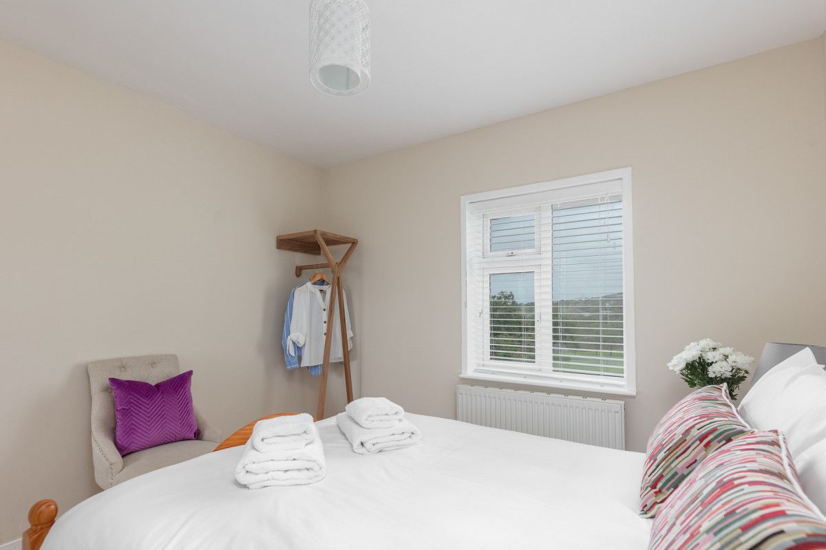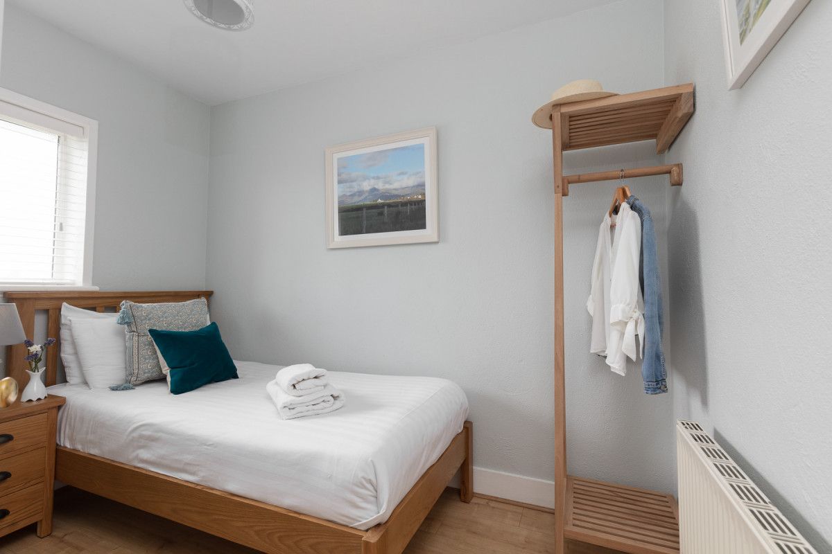 Double bedroom 2 is similar and also faces towards the front of the house. It also has a chic hanging rail and two bedside tables with lamps. Bedroom 3 is a single on the ground floor which is wheelchair accessible. A hanging rail and side locker.