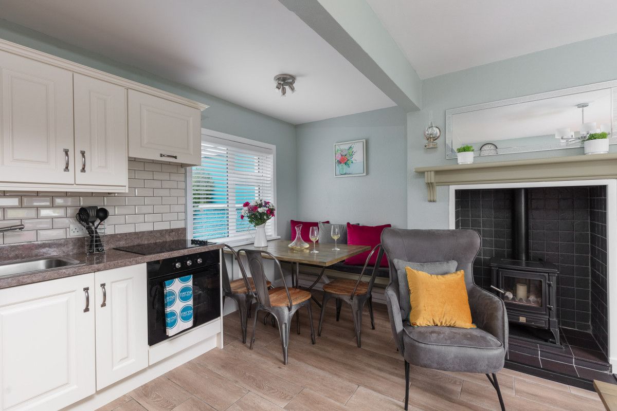The cleverly designed open plan kitchen / living area is the hub of this cute little home. It fills up with daylight thanks to windows front and back and allows plenty of room for all to kick back and socialise.There’s a sparkling new fitted corner kitchen with built in single electric oven and hob, a family sized fridge freezer, plenty of storage space and all the standard issue quality items you’d expect from a YNA Stay home.The wooden kitchen table comfortably seats 5-6 people and has been thoughtfully placed to overlook the back garden as well as face into the main room.