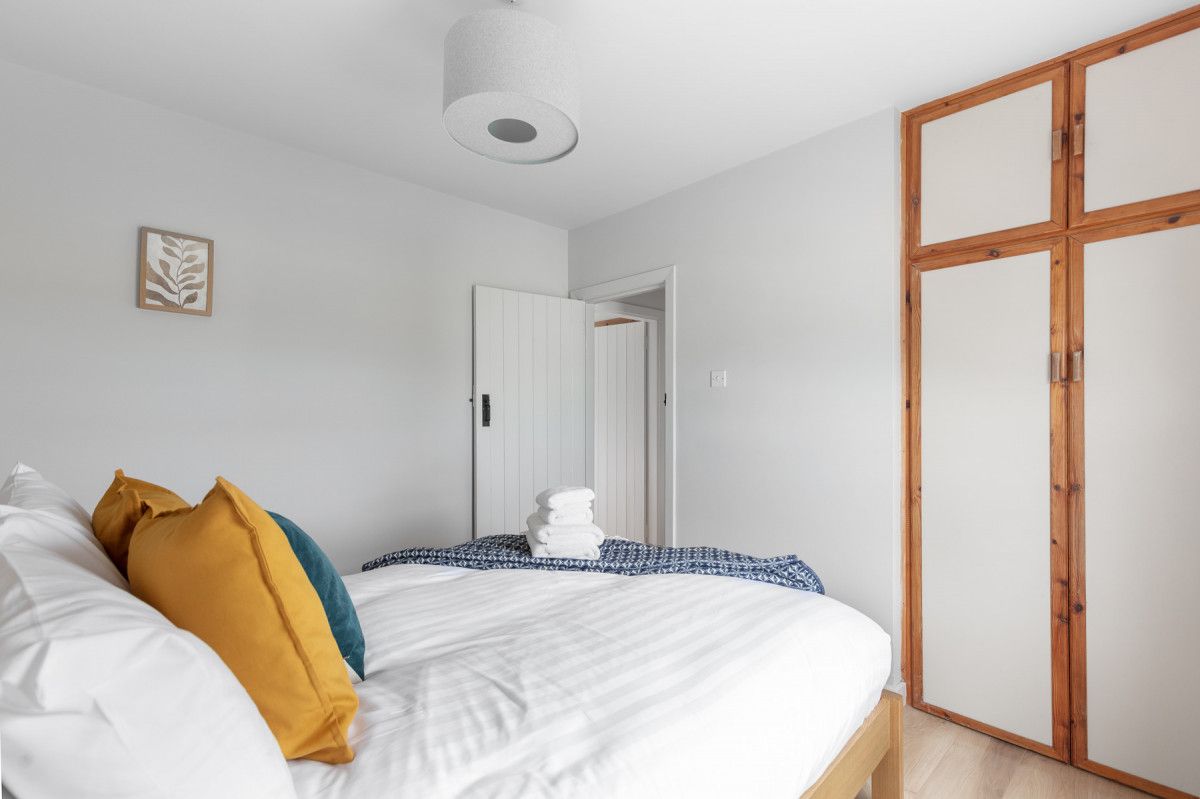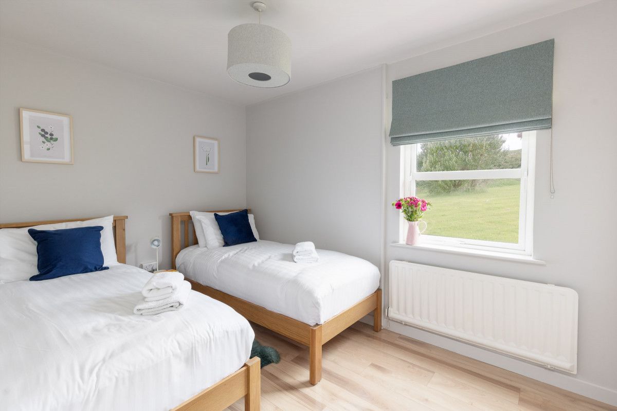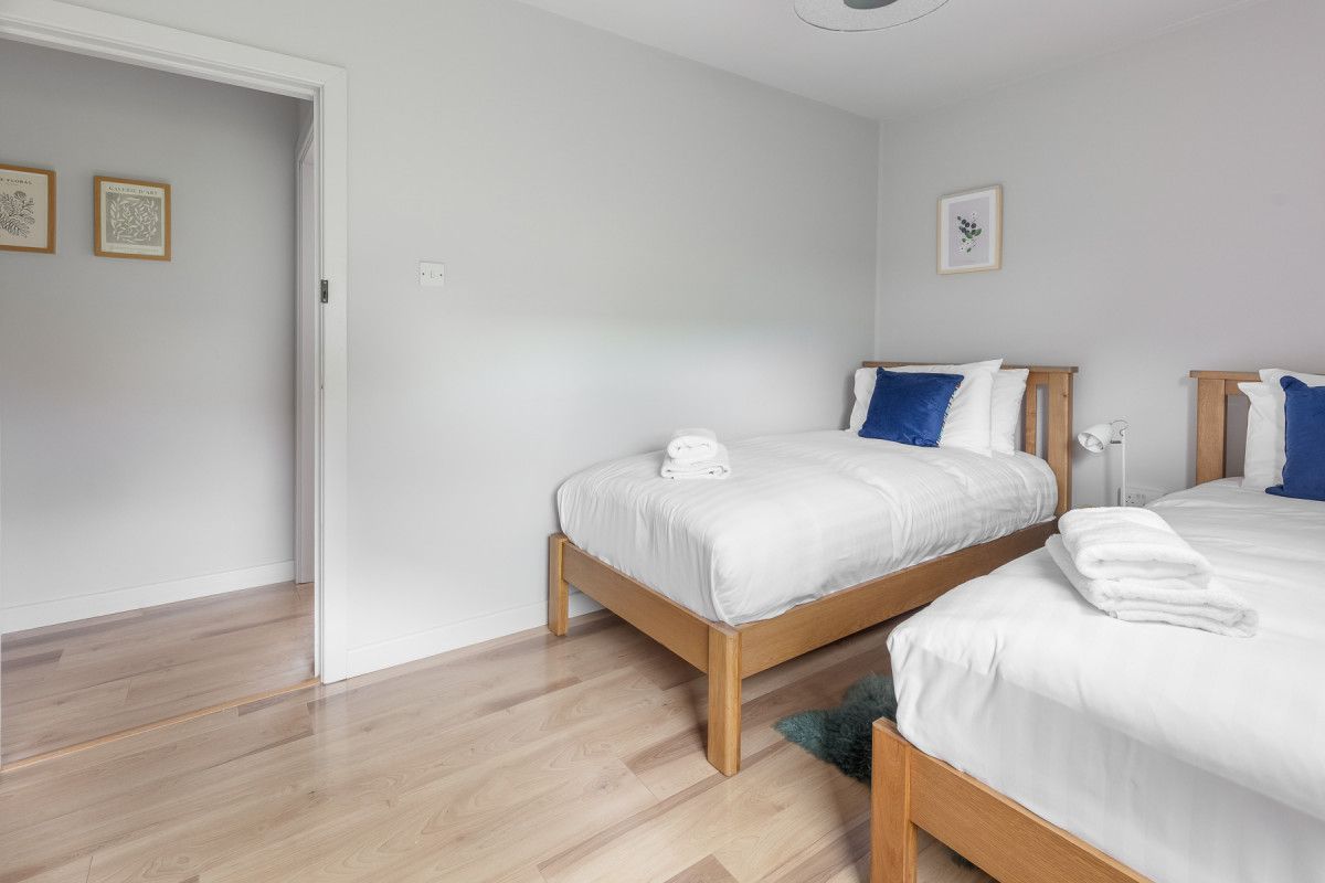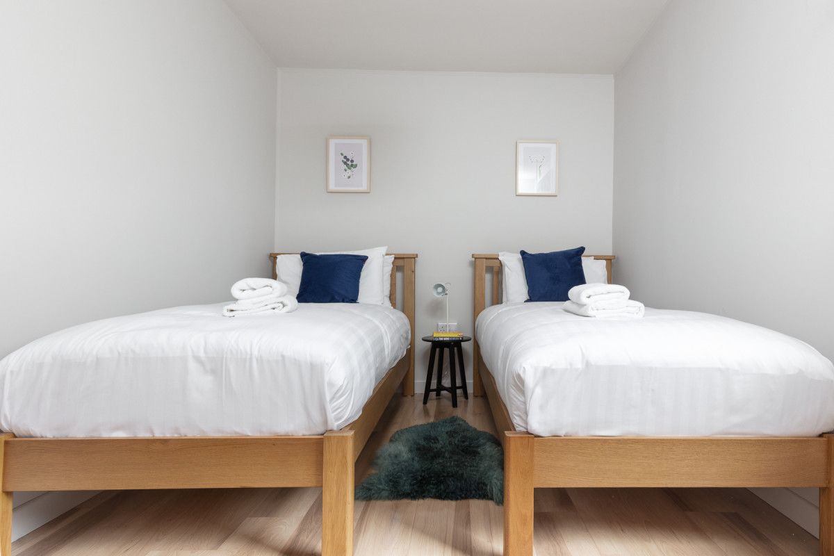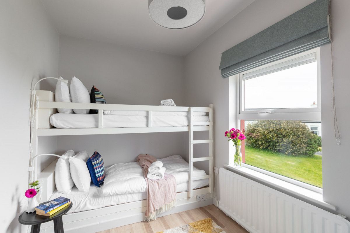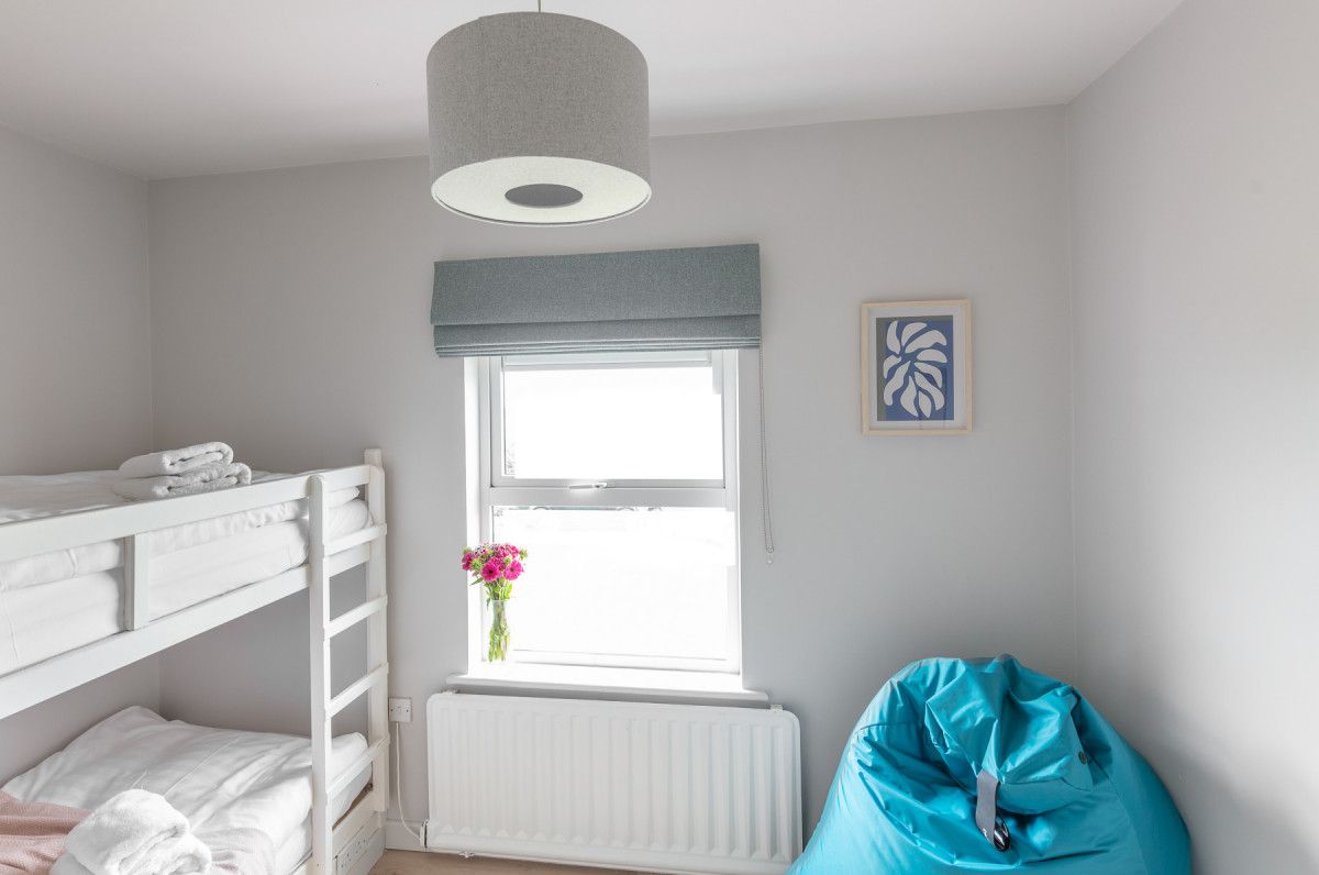 To the front of the house is a kids room with built in bunk beds. It’s a bright, fun room with a wooden floor and a small built-in wardrobe for storage. To the rear of the house is a twin room, painted in the same restful tones, with blackout blinds