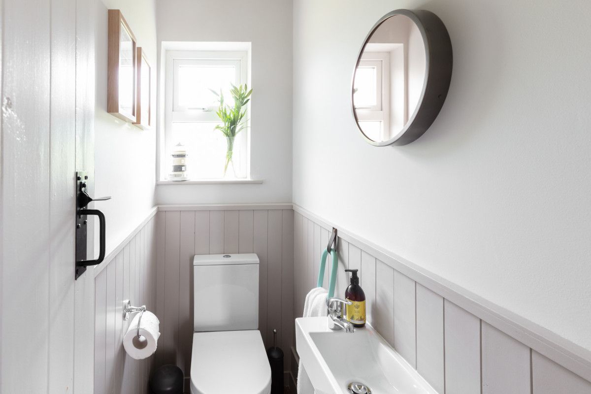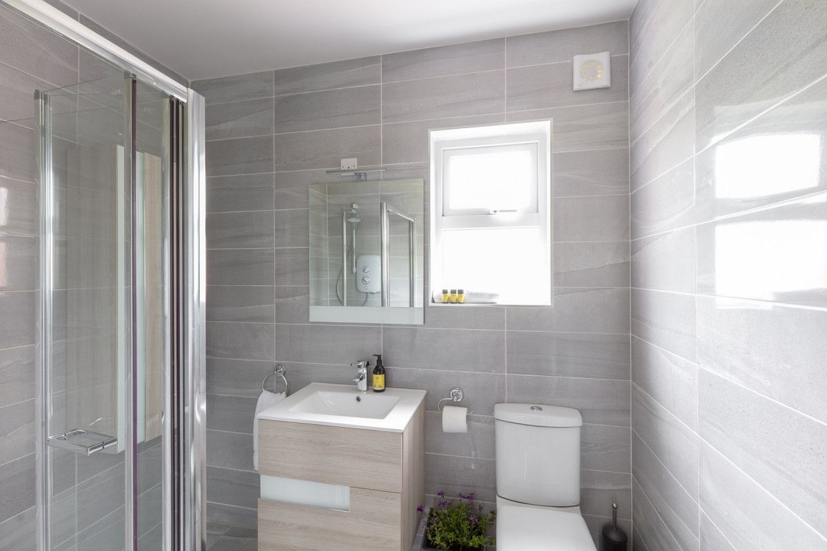 There is a guest WC just off the living area with toilet and sink. The main family bathroom is tiled in chic floor to ceiling grey with contemporary fittings, electric shower and a sizeable wall-mounted storage cabinet.