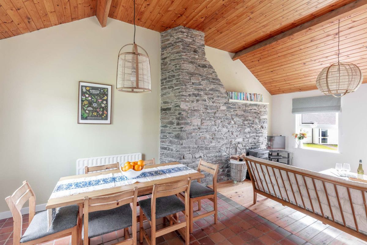 The main living room area is demarcated by wooden floors and features a traditional stone wall behind the stove fireplace. A compact dining table seats six and the tiled galley style kitchen tucked around the corner from the living area includes a double oven and hob, microwave, dishwasher, washing machine and fridge freezer.