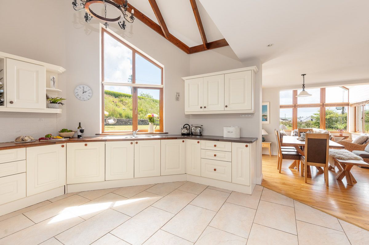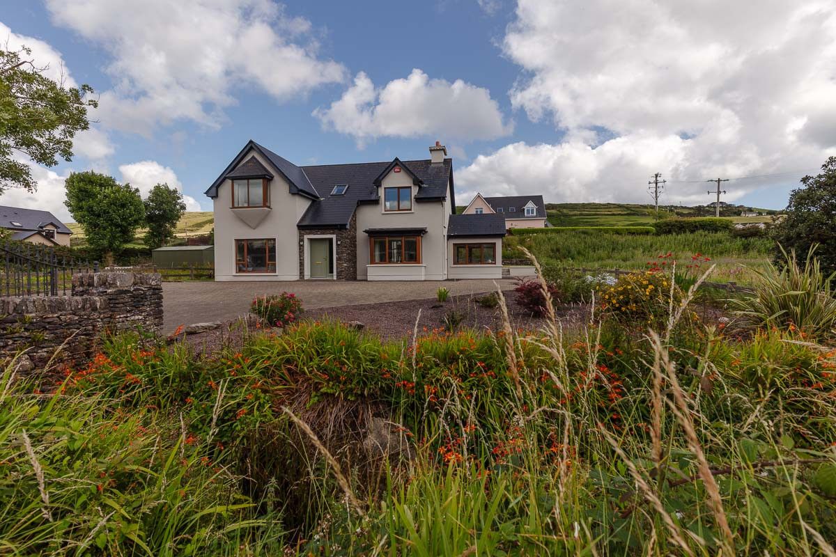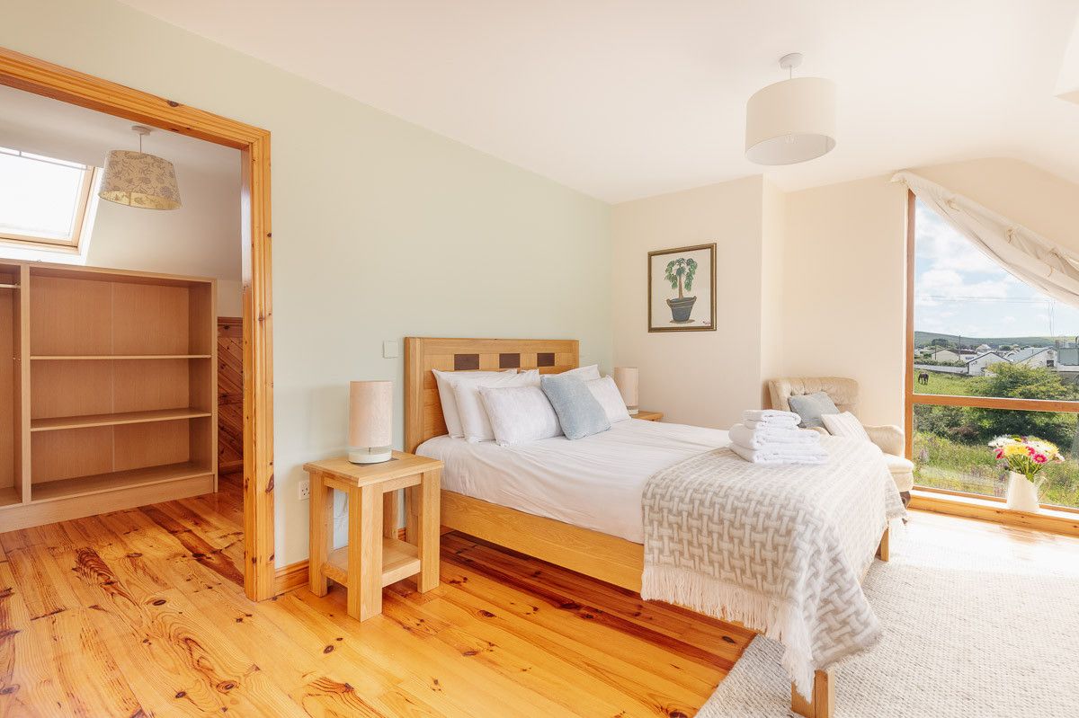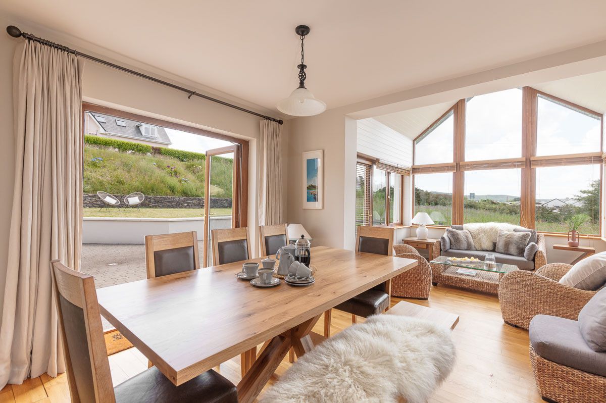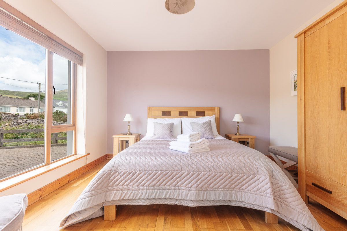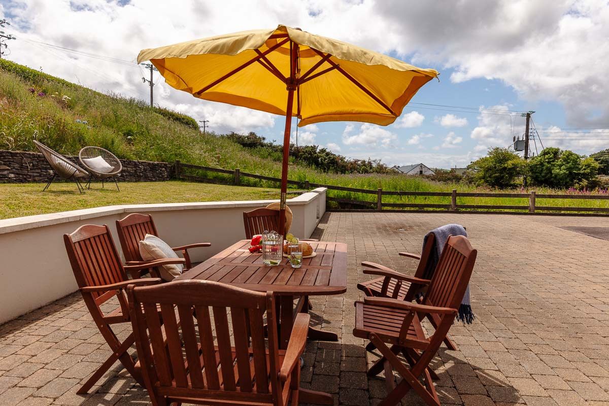The paved patio area is extremely generous and there is a wooden garden dining table with sun parasol and seating for six people to allow guests to enjoy their meals al fresco in the enticing Dingle sunshine. There is also a lawned area which contains two round contemporary sun seats so that guests can relax outside with a cold drink and good book.