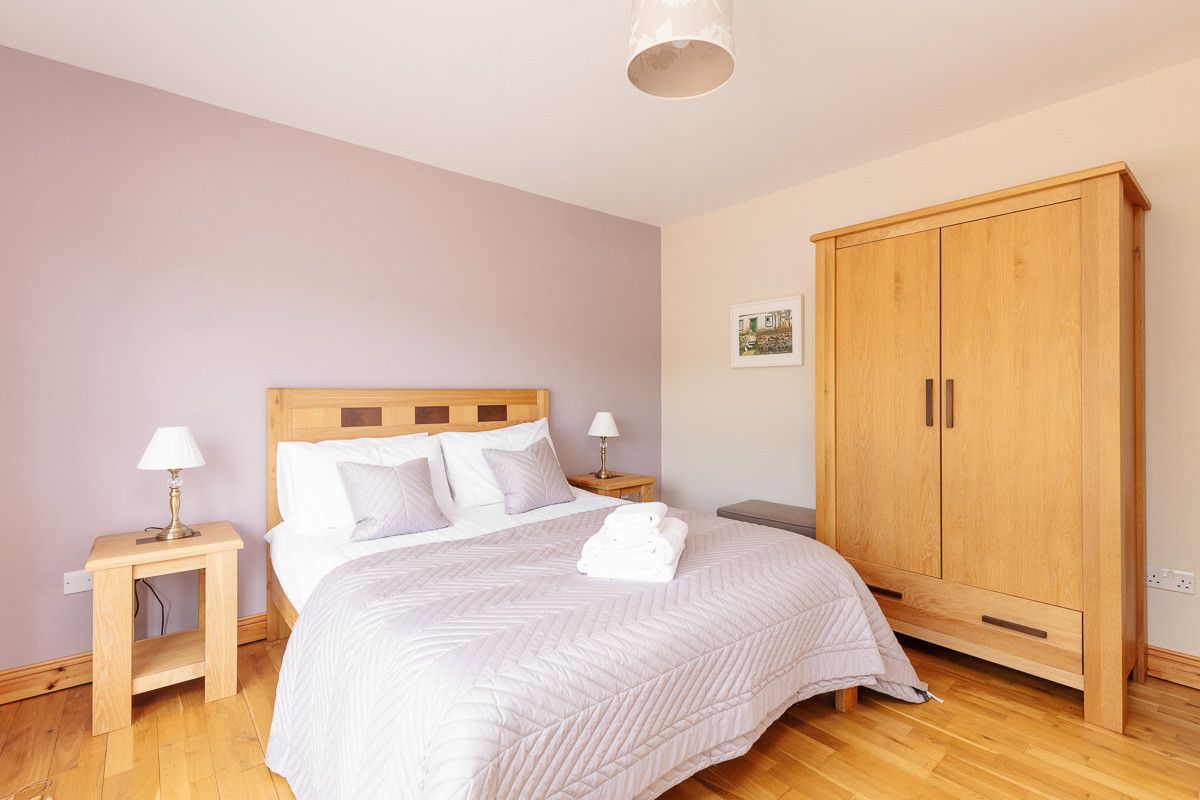 There are four bedrooms, one on the ground floor and three upstairs on the first floor. The ground floor bedroom is a double with a king size bed and double wooden wardrobe. There is also a big chest of drawers, and easy chair. The large windows in this room make it light and airy and the pleasant mix of pine features combined with a lavender and cream décor help to ensure a relaxing and peaceful atmosphere. There is a separate family bathroom that services the ground floor bedroom.