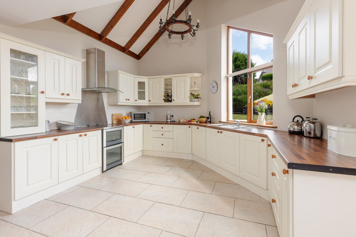 The light cream country kitchen is beautifully spacious with a vaulted style ceiling and boasts a lot of storage cupboards and wood countertop. As well as the oven, grill and electric hobs, there is also a microwave, kettle and toaster. The rustic style of this country kitchen blends with a contemporary flair from the American style silver double door fridge and freezer. There is a utility room attached which houses the washing machine and dryer.