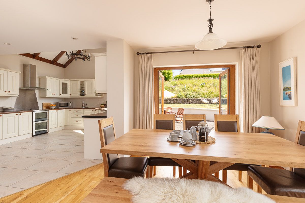 The open plan living area blends together the spacious dining area and sizable coffee and cream style kitchen that boasts a vaulted style ceiling. There are two lounge areas both surrounded by large windows, so guests may enjoy views out to the garden and neighbouring countryside. The vaulted garden lounge possesses a stylish two seater wicker sofa and matching armchairs topped off with a matching glass topped coffee table. The main lounge area is separated from its counterpart by a handcrafted stone wall incorporating the real wood fire. There is a long, leather three seater sofa and a matching two seater sofa surrounded by windows an eggshell blue, feature wall with a wall mounted flat screen TV.