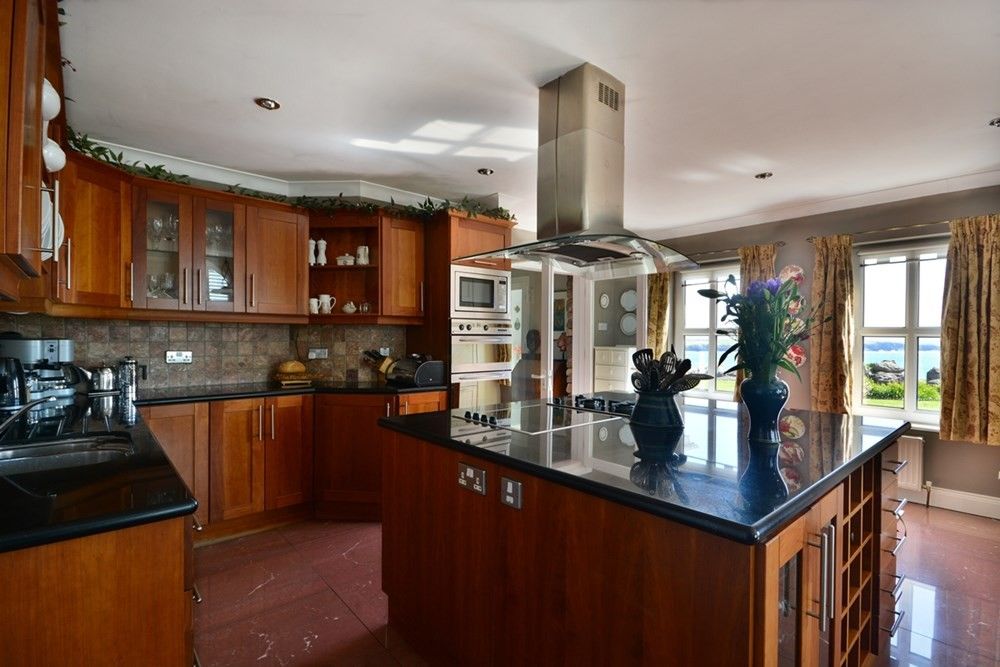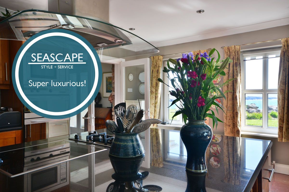 Seascape has three bedrooms, one double on the first floor, and two sizable bedrooms upstairs. The downstairs bedroom is furnished a fresh, light palette. There is a walk-in closet and an ensuite shower room that has double doors so is also wheelchair accessible. The two spacious bedrooms upstairs offer fabulous views of the sea. Upstairs, the luxurious master suite master/family bedroom has a double bed, a double sofabed, and a couch. Across the landing is a second spacious bedroom furnished with beautiful antiques and styled in rich hues. It features a superking size bed, and ensuite shower room. Between the two upstairs bedrooms is a richly furnished lounge area with a floor-to-ceiling library that enjoys a wonderful view of the sea.