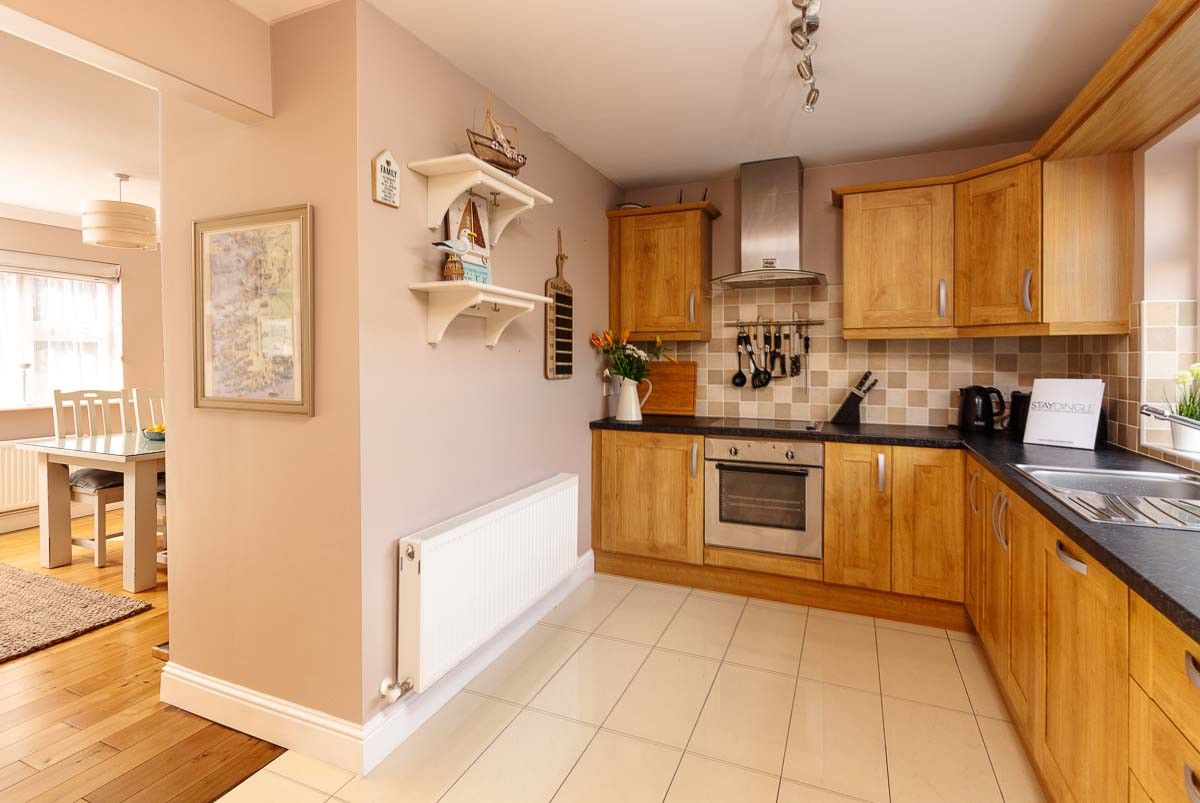 Open the front door to the heart of Dingle town, or gaze out the back windows to rolling fields; this superbly-located house has every amenity on its doorstep, and stunning countryside vistas to the rear. Enjoy all the buzz of the vibrant town or relax at home in peace and comfort. Dingle has a great variety of restaurants and buzzing pubs and it’s all at the end of your street.