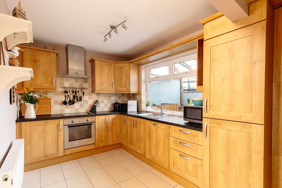 Entering the house from the street, you are right into the heart of it, with a dining area and cosy wood burning stove. The dining table seats six comfortably. Soothing colours create an oasis of calm and cosiness. An archway leads into the fully-fitted kitchen with all appliances and electric hob, oven and microwave perfect for holiday cooking needs.