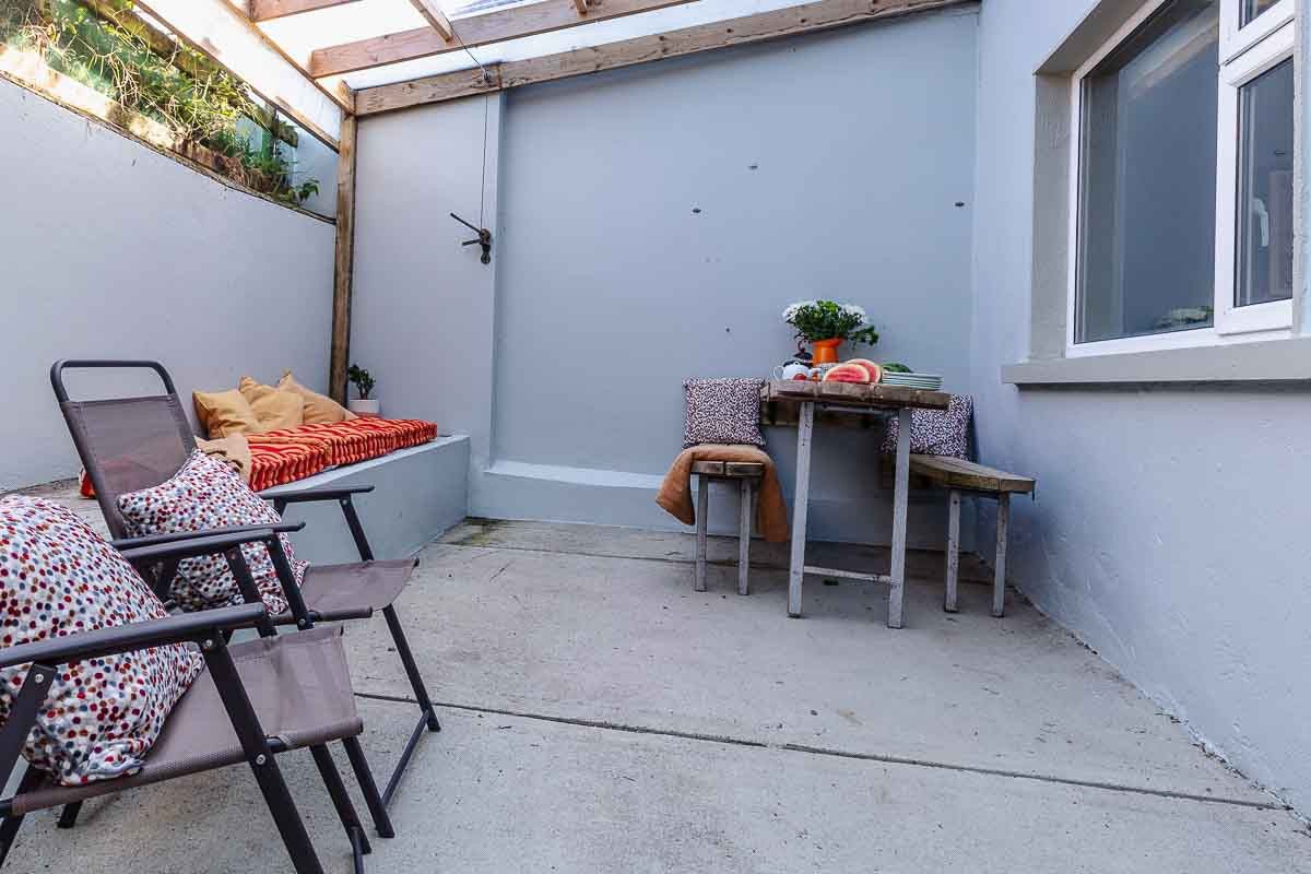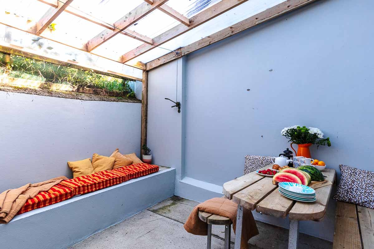 A small outdoor space to the rear of the house is covered with a pergola, ideal for creating shade for outdoor dining on a sunny day, and drying clothes and swimming gear on a not-so-sunny day!