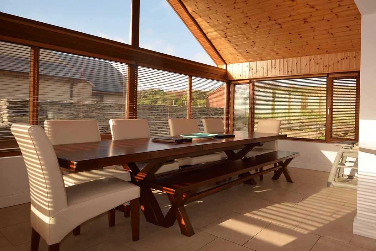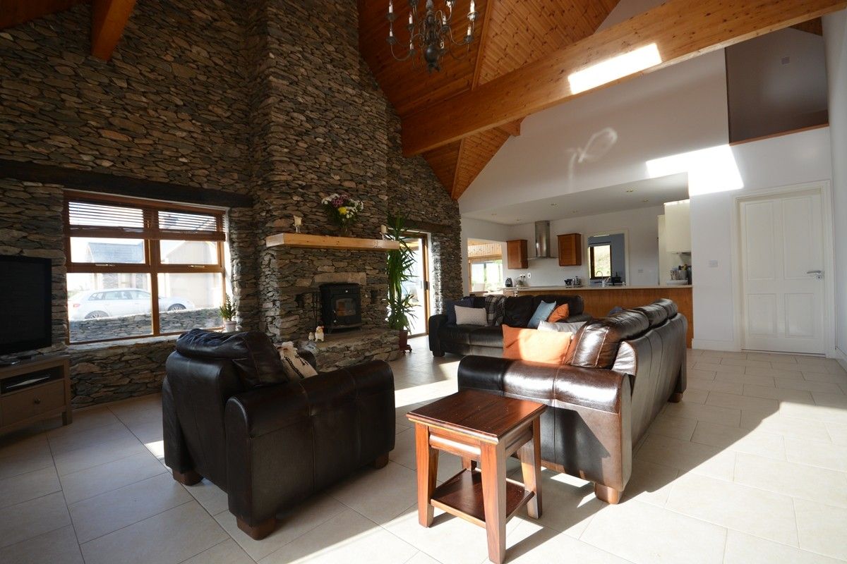 Great Blasket View has a large open plan living area with a high vaulted ceiling that includes the lounge, kitchen and diner. The lounge has the WOW factor with a high wall of traditional stonework, a wood burning stove, snug leather couches and wonderful views. The contemporary kitchen has a double oven with an electric hob, a large double fridge with ice maker, microwave, kettle, toaster and oven. The dining area is largely glass so flooded with light and a super sized natural wood table.