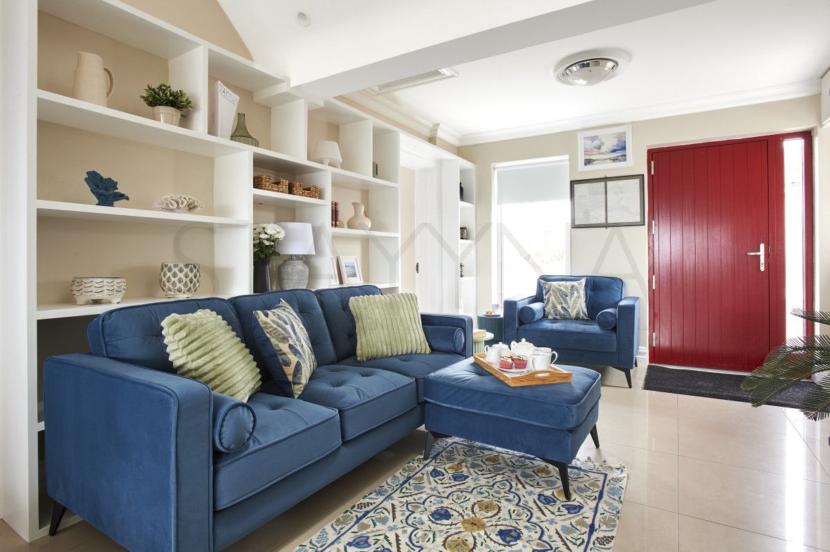 The open plan living area is light and airy with a soft palette of cream and white. The comfortable three-seater sofa is a deep blue with matching footstool and plush armchair. The aquamarine cushions and coffee table combine to remind guests of the ocean waves just outside their window.
