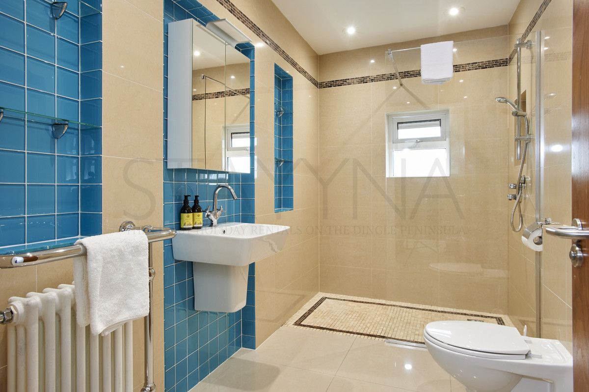 The large spacious bathroom possesses a walk-in shower, mirror unit and sink and toilet. The neutral sandy beige tiles mixed with pops of sea blue again add to the adorable beach side feel of the property.