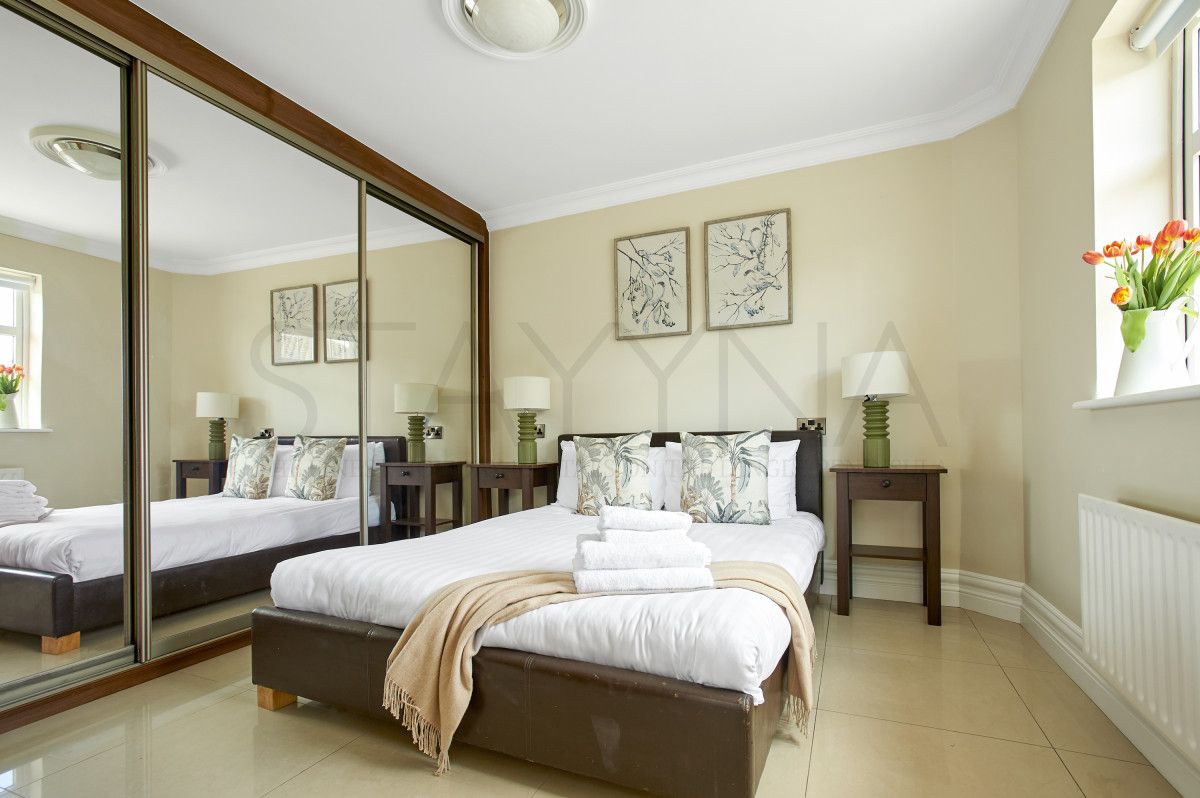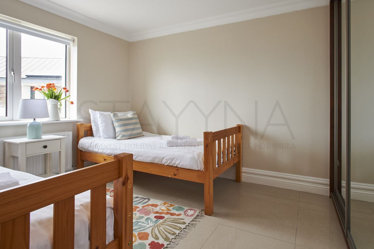 The master bedroom boasts a comfortable double bed with bedside table and wardrobe. The second bedroom is a twin room with two single beds.