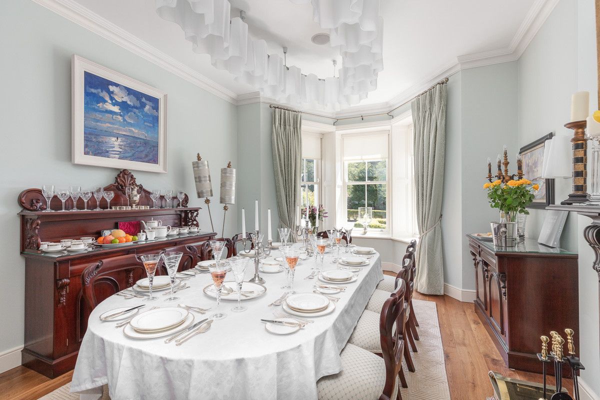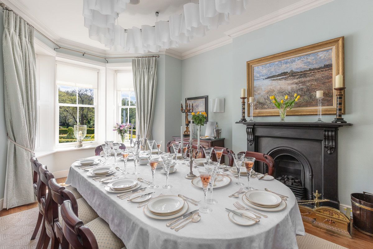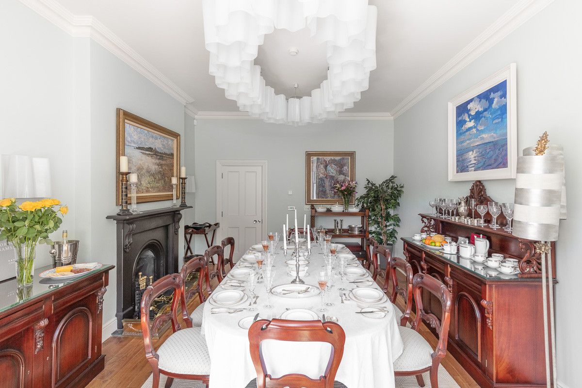 At the end of this hallway, you will find a beautiful formal dining room, furnished with antiques and set with elegant crystal glasses and porcelain crockery, a great place to get dressed up, if you fancy that, and enjoy a dinner party.
