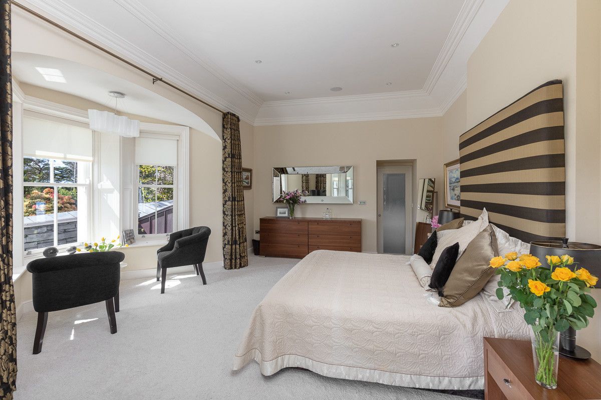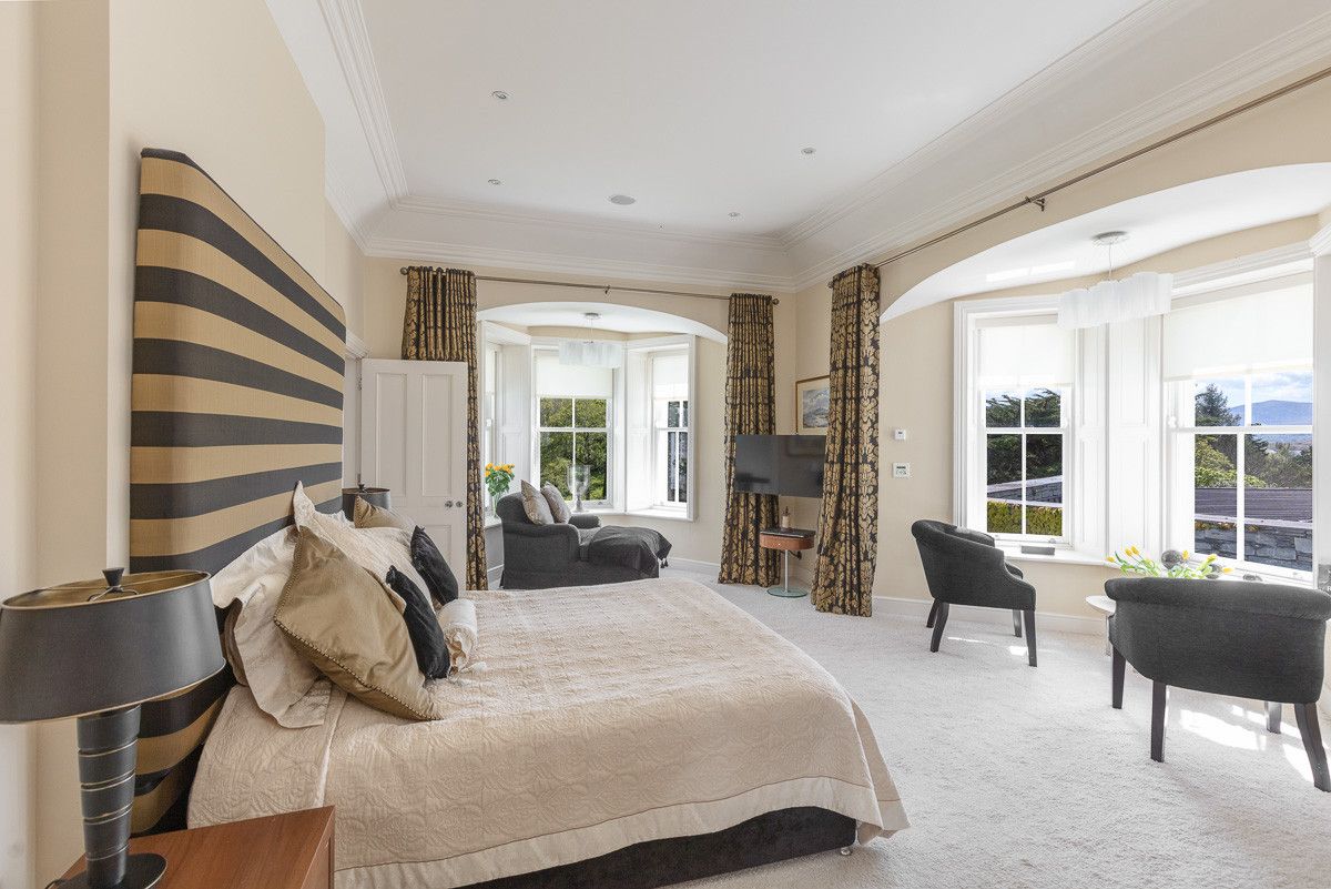 As you go up the stairs you will find the hallways lined with beautiful paintings, some by well known Irish artists. At the very top, to the left, is the master suite, a very generous bright room. This a room you can really relax in with a chaise longue in the windows overlooking the lake and easy chairs in the windows to the front of the house. Off this is a luxurious bathroom with a double sink and large bath, a separate shower room and a dressing room.
