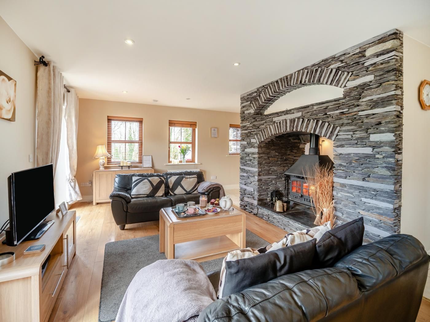 Pet- and family-friendly, it has a stunning split-level main living space, plus enough bedrooms to sleep nine – two of them on the ground floor, and two with en-suite shower rooms. The enclosed garden has far-reaching views across the surrounding fields and peaks.