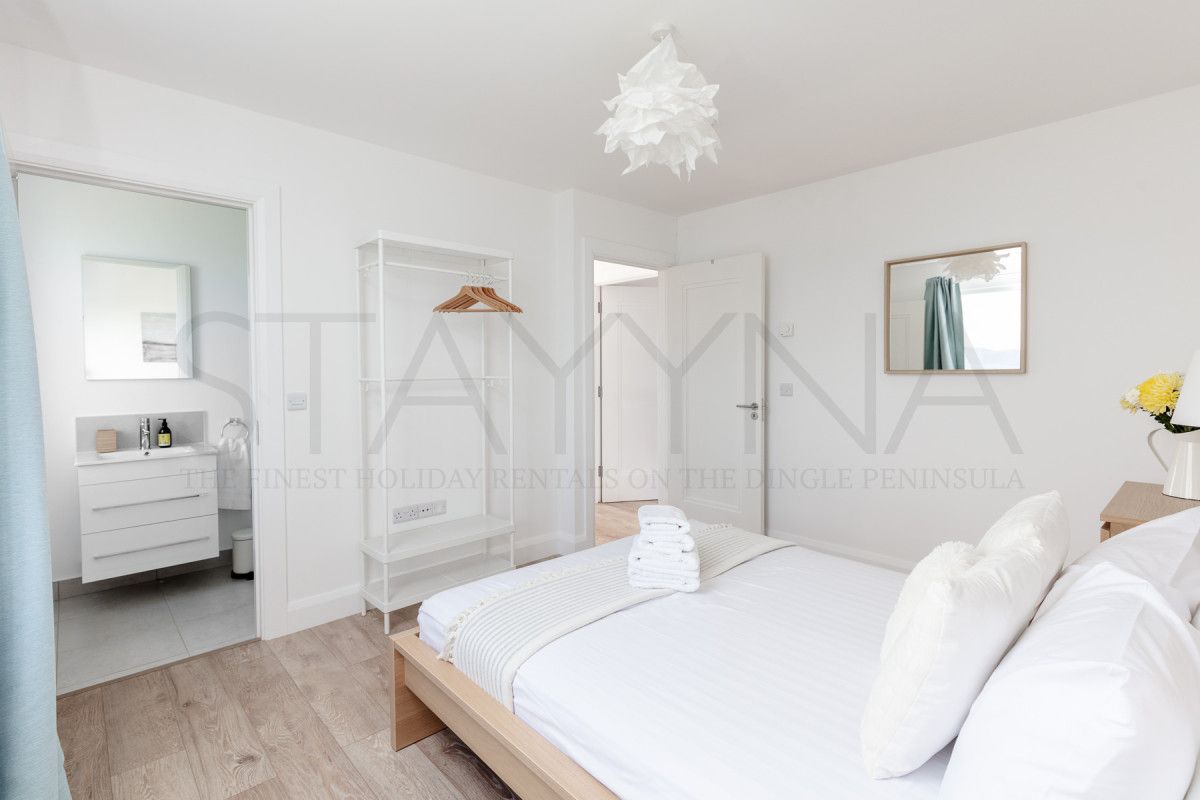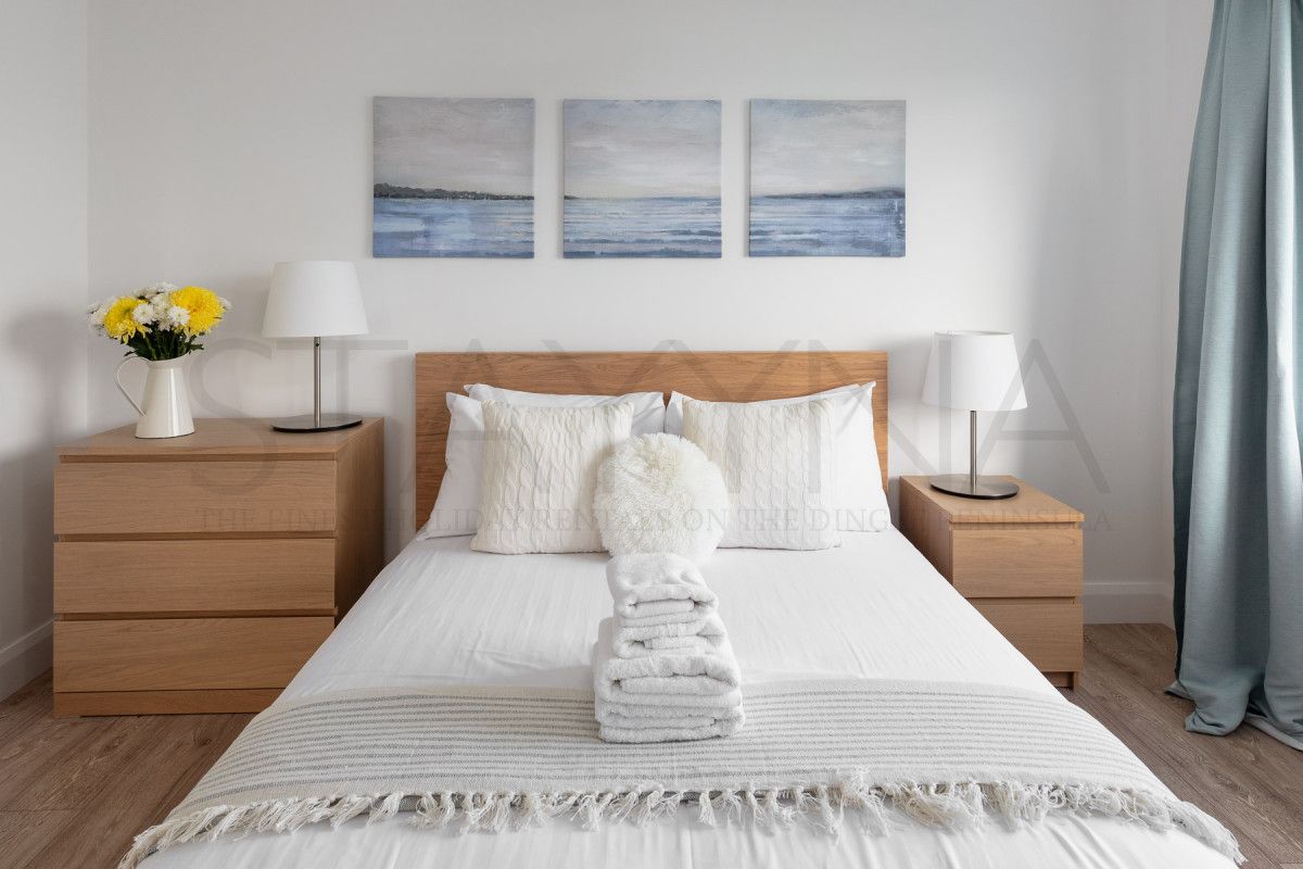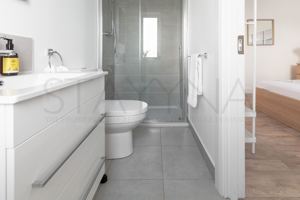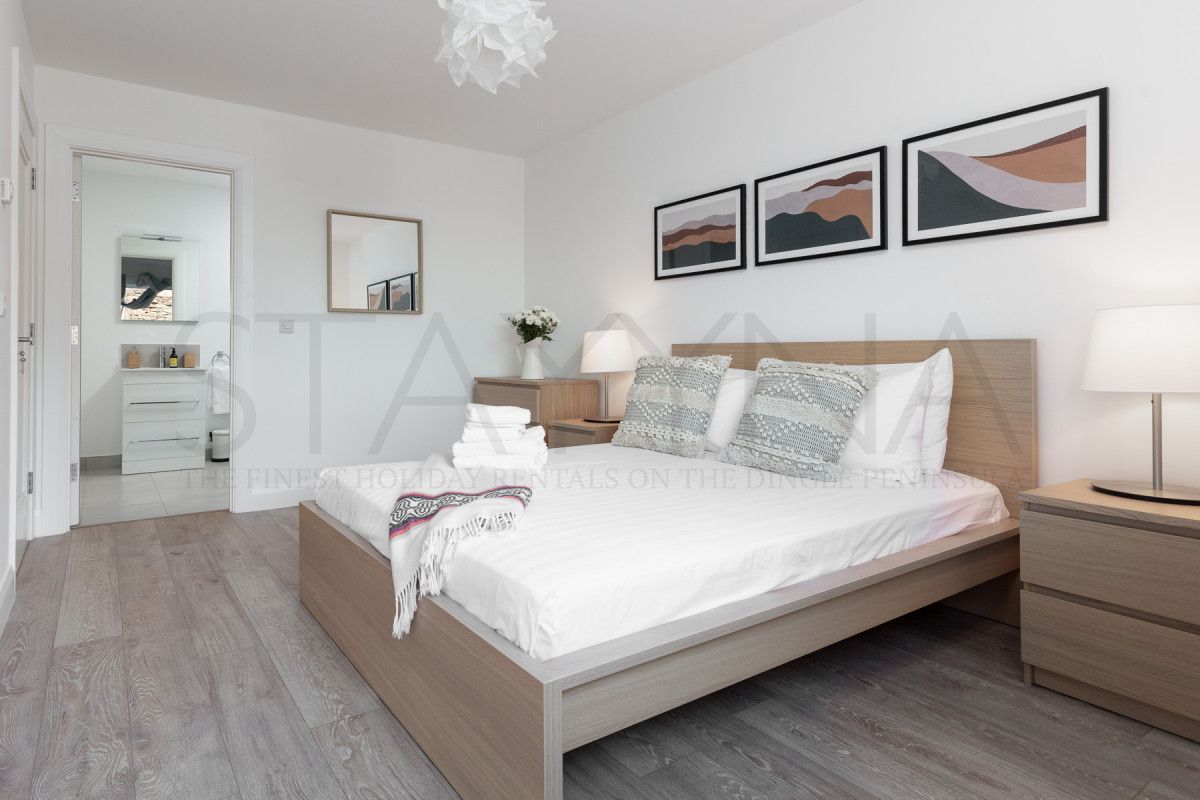 The minimalist style of the front bedroom lets the spectacular view take over - an incredible sight to wake up to from the super comfortable double bed. The furnishings are completed with drawers and a clothes rail, The en suite bathroom continues the cool clean style with a rain shower.