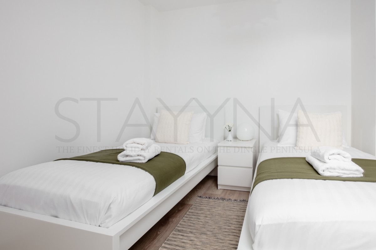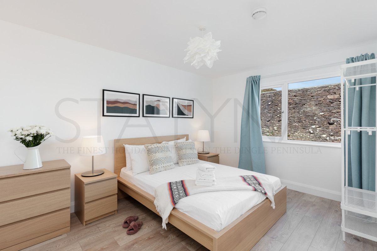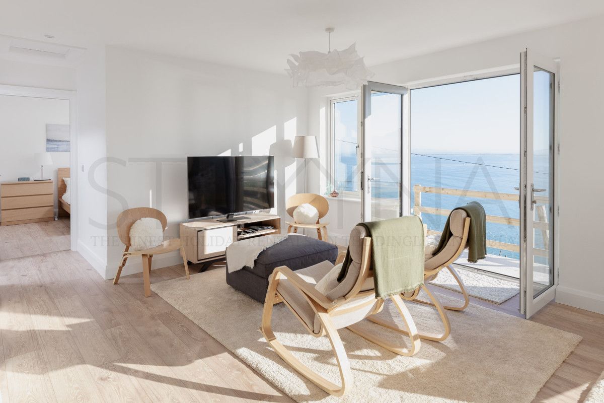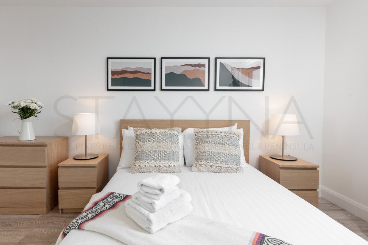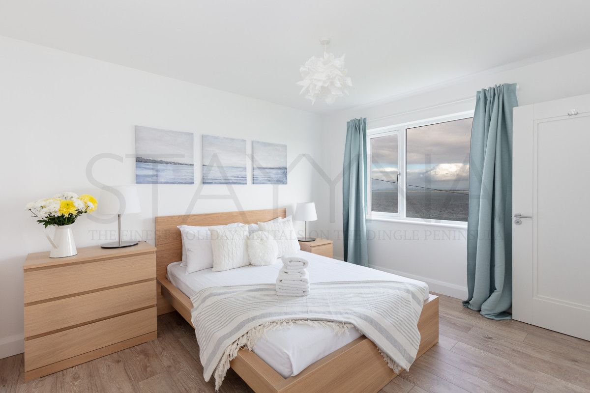 The minimalist style of the front bedroom lets the spectacular view take over - an incredible sight to wake up to from the super comfortable double bed. The furnishings are completed with drawers and a clothes rail, The en suite bathroom continues the cool clean style with a rain shower.