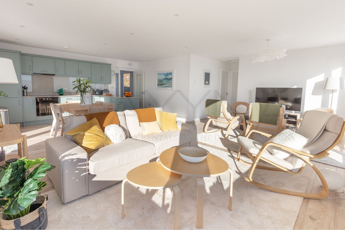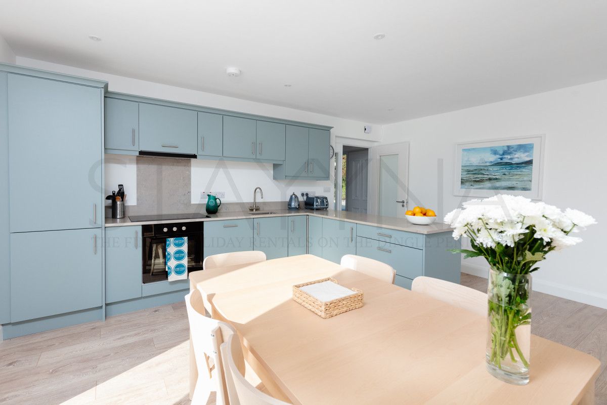 Decorated in a calming grey-blue, with minimalist styling, the modern kitchen is fully-equipped with oven, hob, fridge-freezer, dishwasher, kettle and toaster. A stylish dining table in contemporary wood seats six, with French doors opening out from the kitchen area to a patio at the side of the house, perfect for barbecue season.