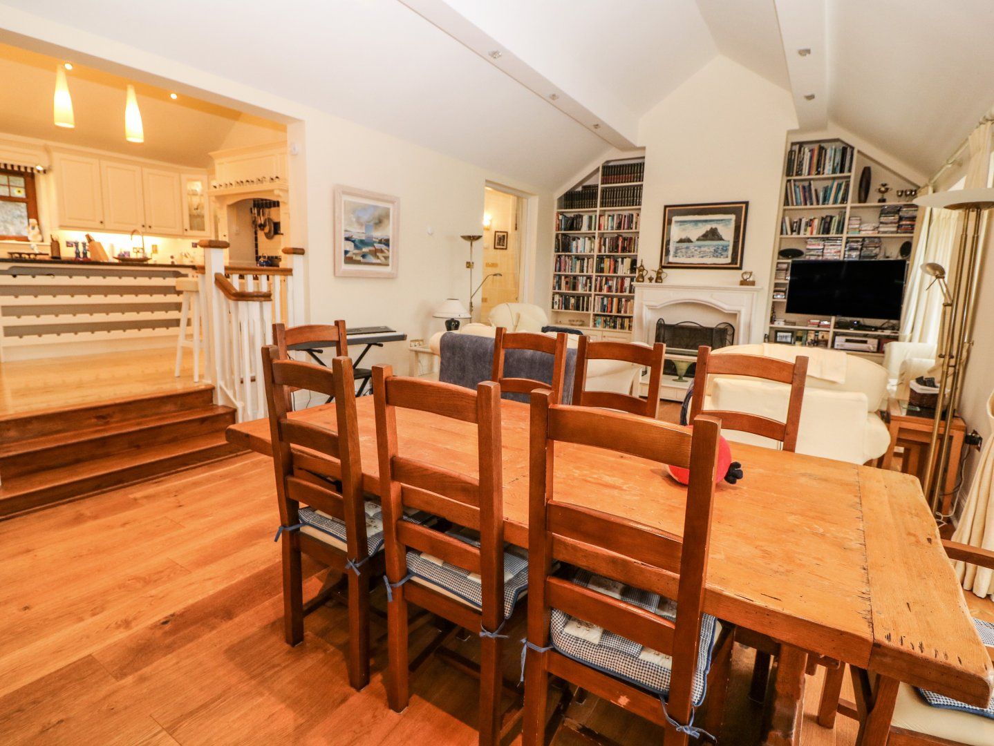 Amenities Underfloor central heating with open gas fire. Gas range with hob and electric oven, microwave, fridge/freezer, washing machine, dryer and additional fridge, dishwasher, Wi-Fi, TV with Netflix, electric piano, CD player, DVD player, selection of books, DVDs and CDs. Fuel and power inc. in rent. Bed linen and towels inc. in rent. Highchair and cot available. Off-road parking for 8 cars. Main entrance is located at rear of house. Front garden with patio, lawn and furniture (and views). Sorry, no pets and no smoking. Shop 3.5 miles, pub 1 mile, beach 0.1 mile. Note: There are steps in the property, excluding the stairs to the first floor, please take care. Note: There are stone steps in the rear garden and it is not enclosed, please take care and supervise children outside at all times. Note: Check-in is from 4pm, check-out by 10am