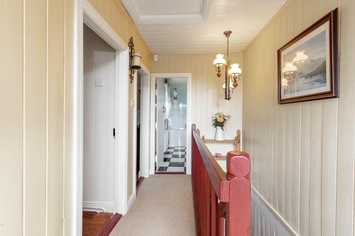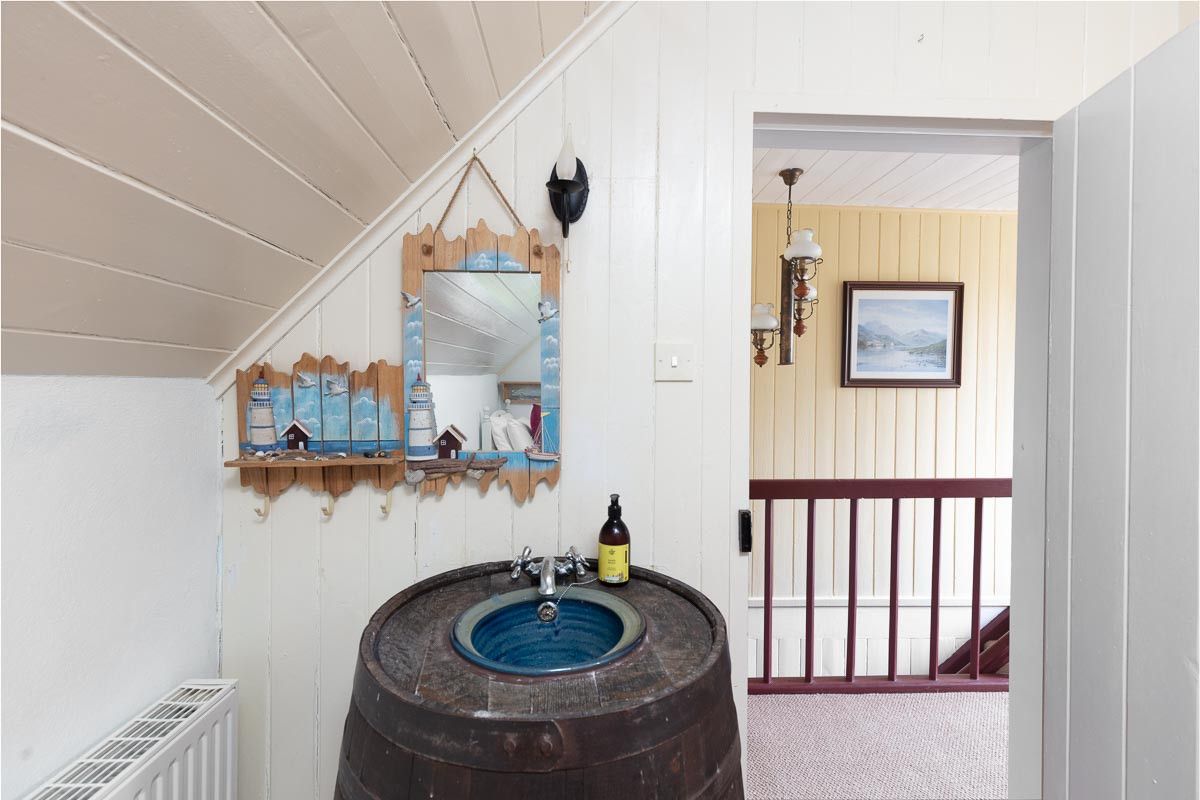 On the first floor (upstairs) there is a family bathroom with a bathtub with overhead electric shower. There is a large antique vanity unit featuring porcelain from renowned local potter Louis Mulcahy and toilet.