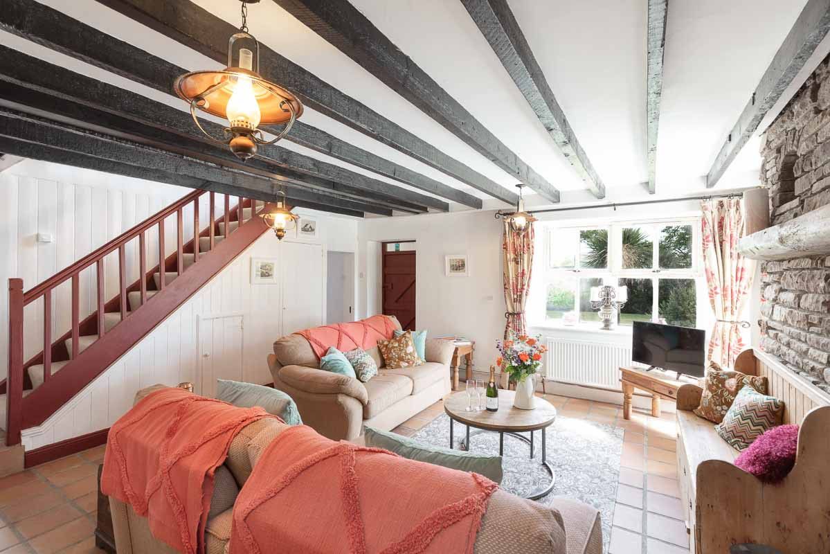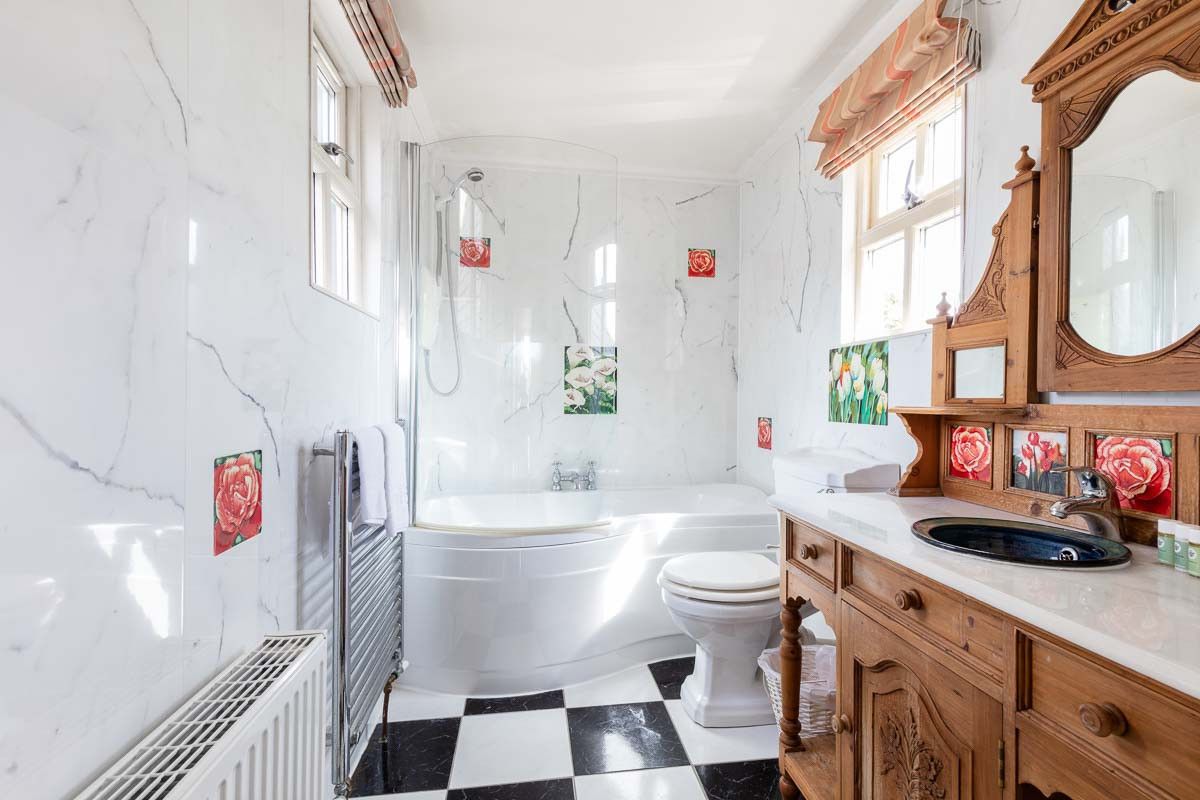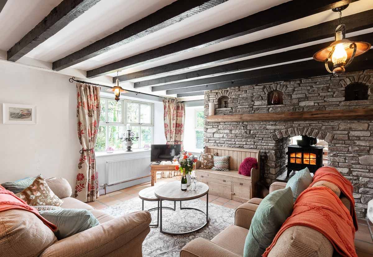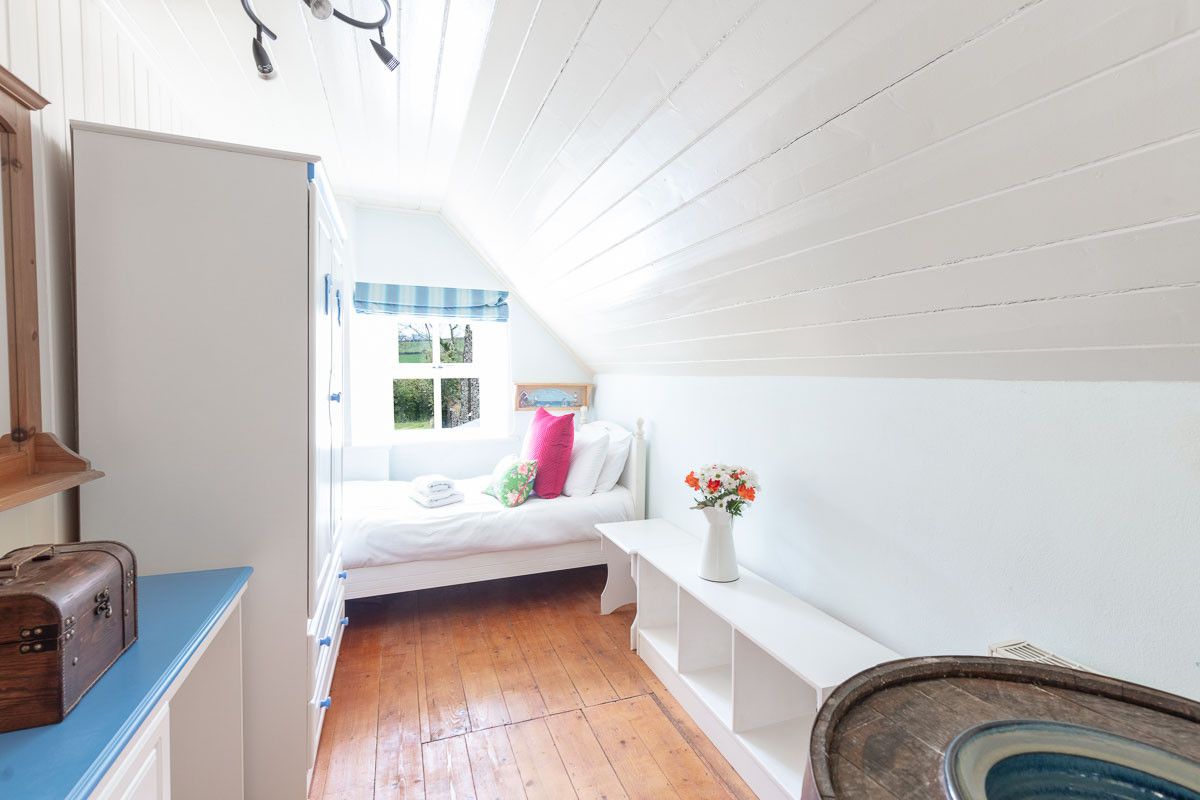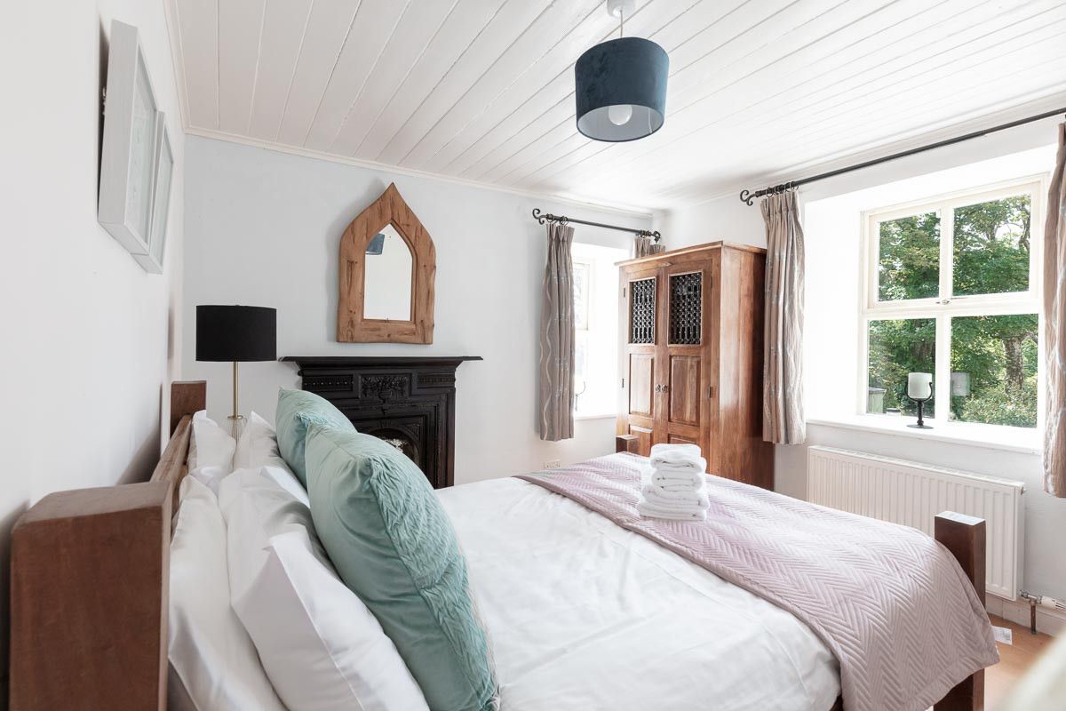 There are four bedrooms in the Coachman’s Cottage. They are oozing with country cottage charm with whitewashed wood ceilings, quirky sloping ceilings, original fireplaces and stone walls peppered throughout.