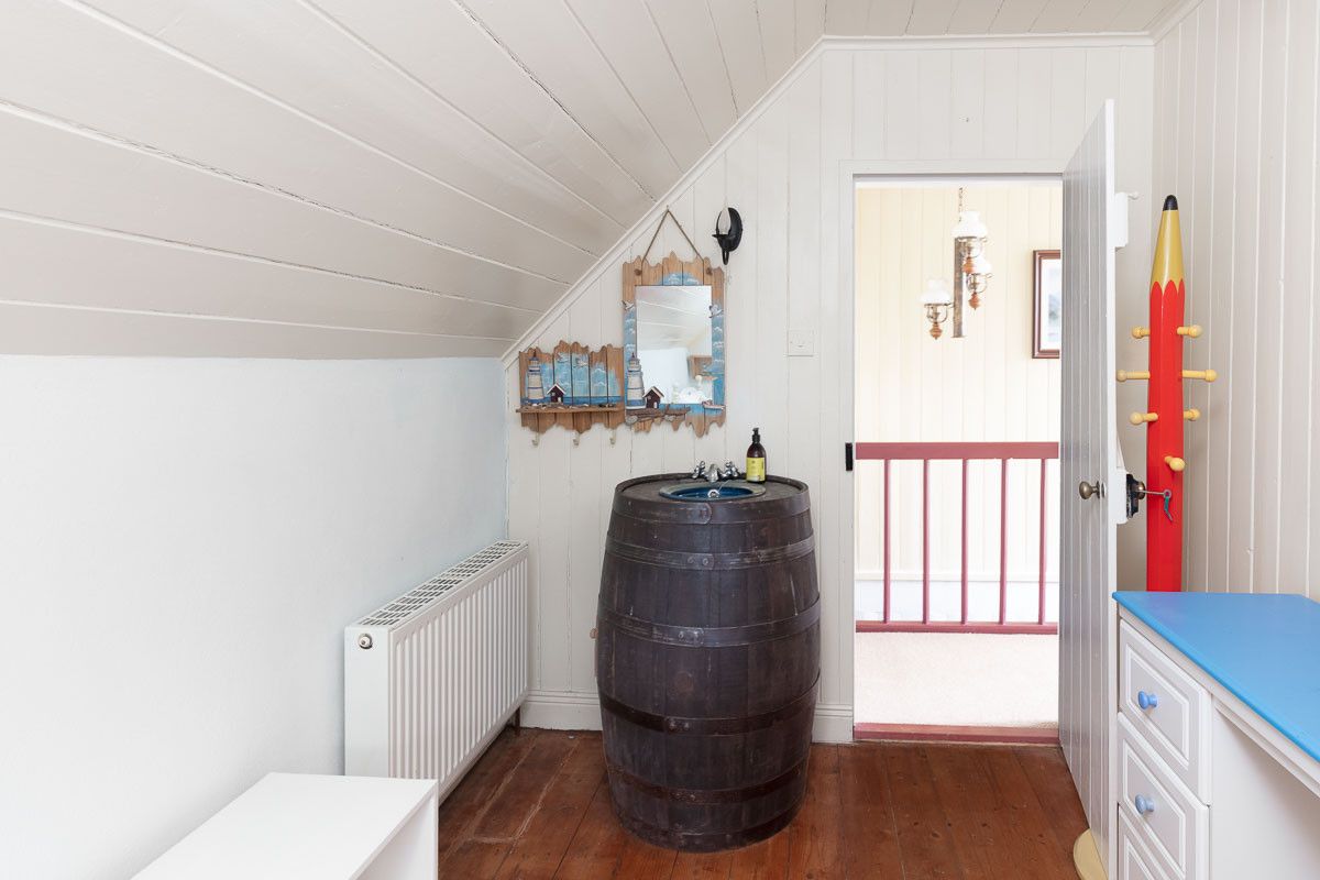 There are two sweet single bedrooms, ideal for the kids, each with single beds, plenty of storage space, and quirky sink units—one in a vintage barrel