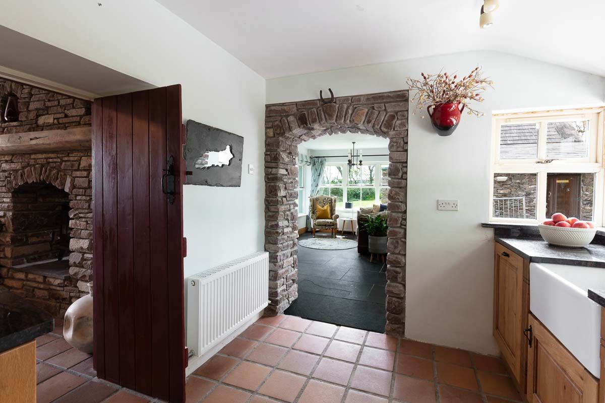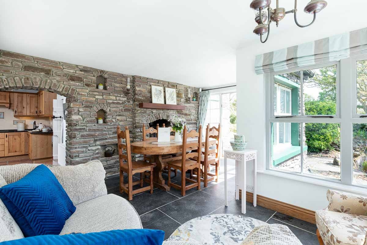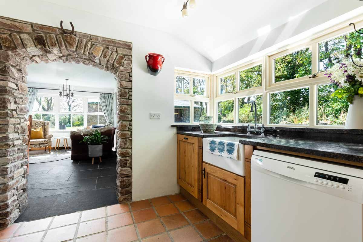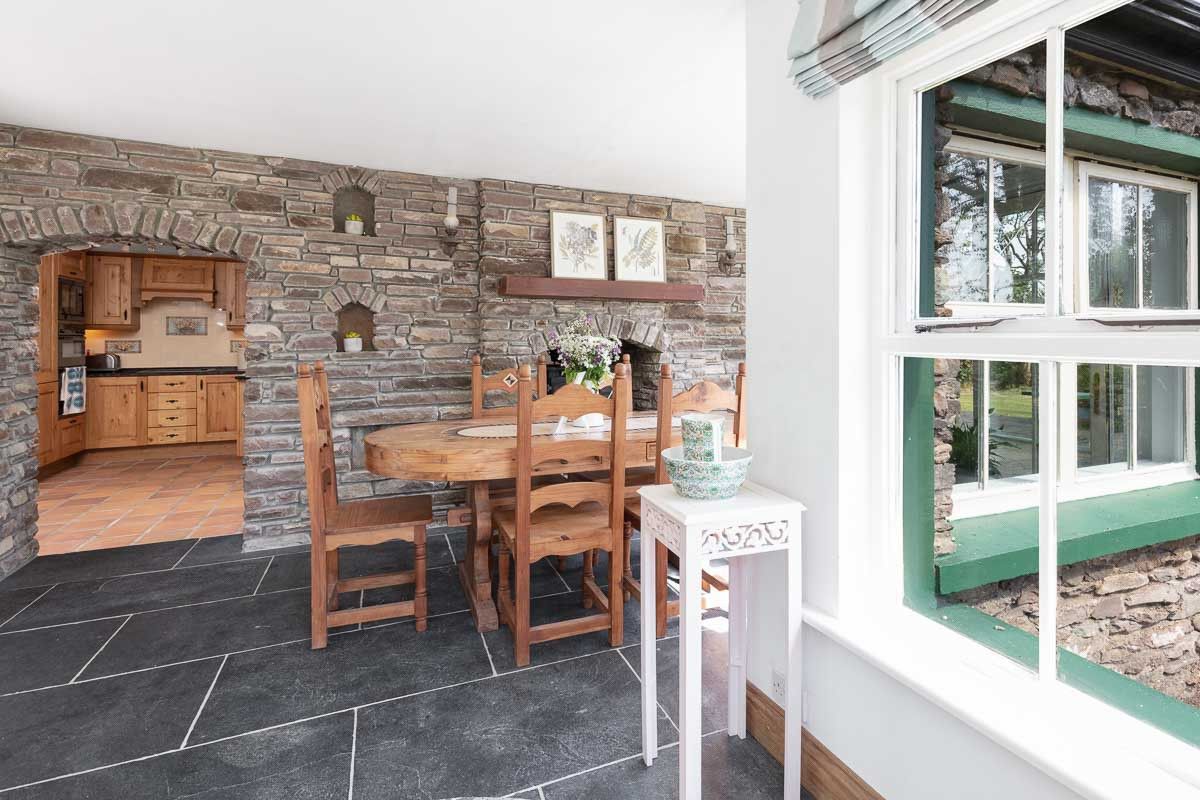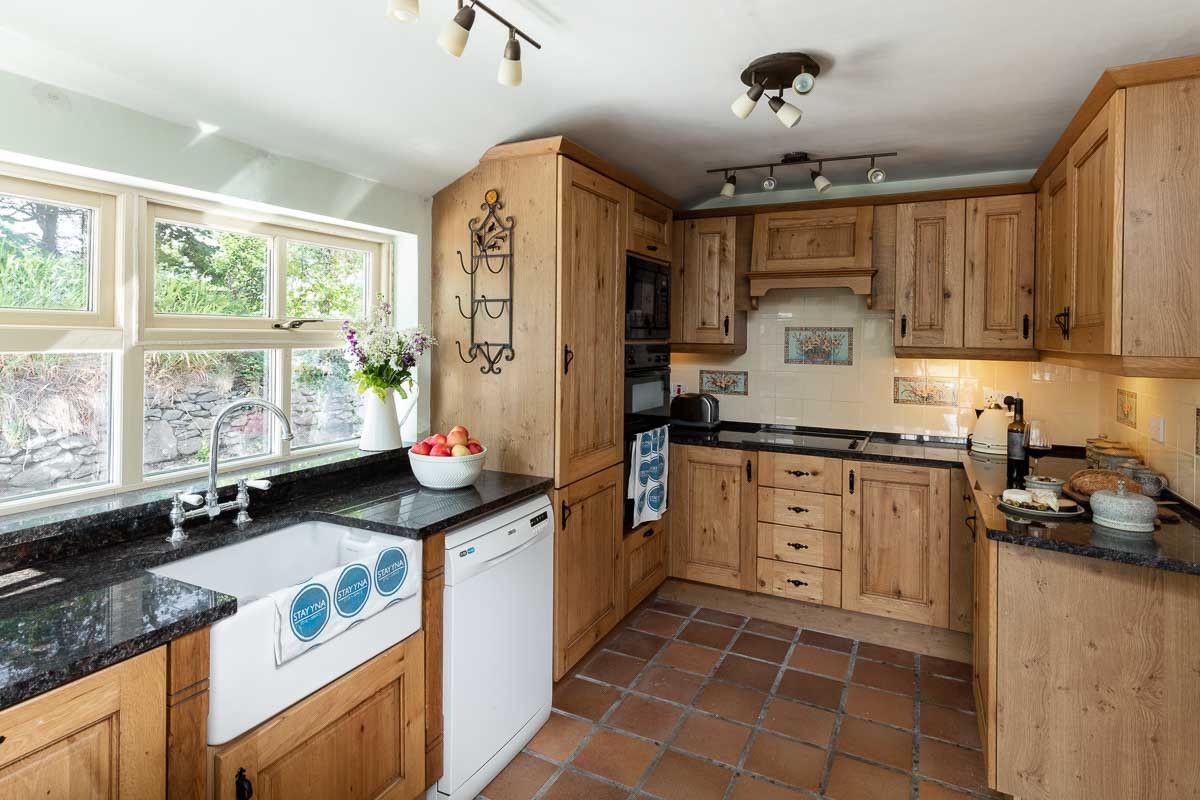 The kitchen is homely and rustic with everything you could need, including a Belfast sink, dishwasher, double oven, microwave and electric hob. A tiled floor and wooden units are modern, but perfectly in step with the unspoiled charm of this historical holiday home. There is a separate utility room on the ground floor with washing machine, dryer and ample storage space for outdoor equipment—you can also access this from a back door. The kitchen leads through to sunroom over-looking the garden with dining table for six and extra lounge area.