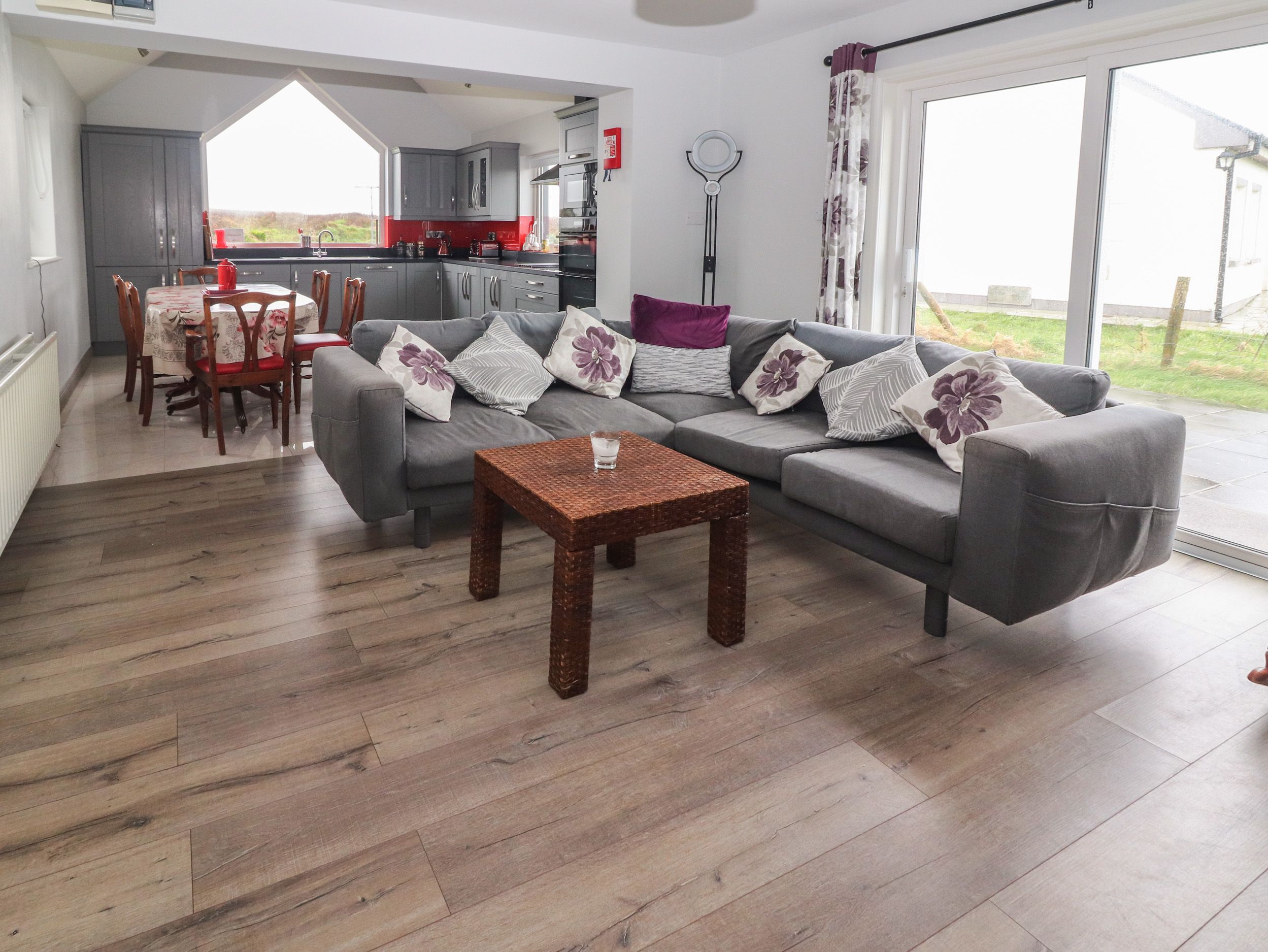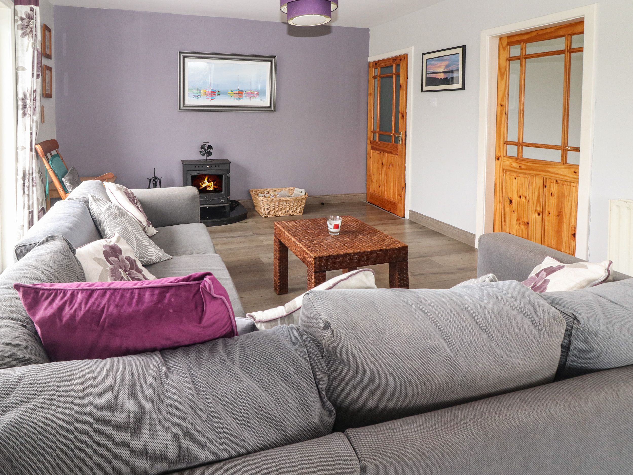 Holiday home BAILE AN CHALAIDH has three bedrooms; one double with en-suite walk-in shower, basin and WC, one double, and one twin. There’s a bathroom with a bath, shower over, basin and WC. There’s an open-plan living space with a kitchen equipped with an electric double oven and hob, microwave, fridge/freezer, dishwasher, kettle and toaster, a dining area and sitting area with a solid fuel stove. There’s a utility with a washing machine. There’s a sitting room with solid fuel stove and TV. Central heating, WiFi, fuel and power, bed linen and towels are included in the rent. A highchair and travel cot are available on request. Outside there’s off-road parking, an enclosed rear garden with a lawn and patio and a side garden with lawn, patio and furniture. Sorry, no pets and no smoking. Nearest shop in 5.9 miles, pub in 1.8 miles, beach in 1.5 miles. BAILE AN CHALAIDH is your next Irish escape.