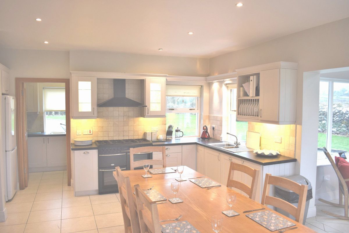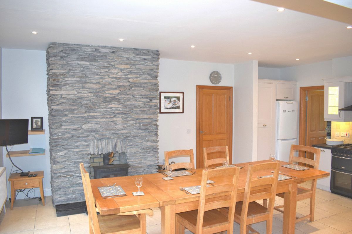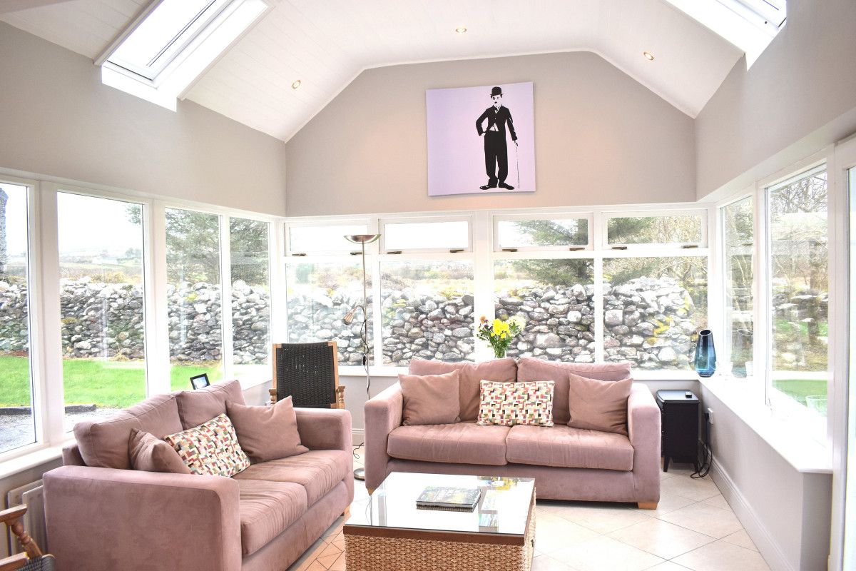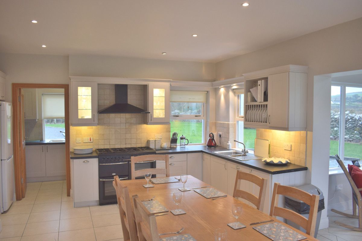 Very large bright and spacious modern kitchen with gas / electric cooker, dishwasher, fridge / freezer, extensive storage gas fireplace and connecting into the sun room that overlooks the beautiful Kerry Mountains with views over Lough Currane.