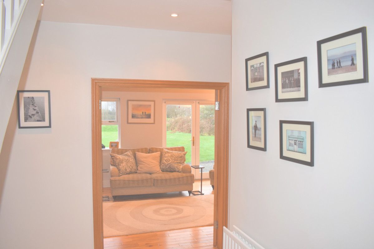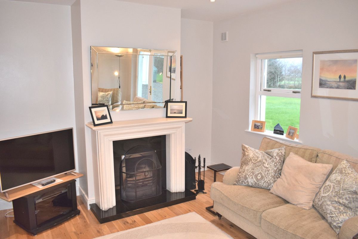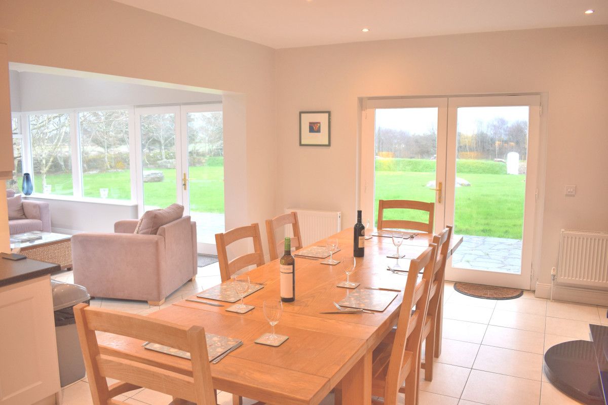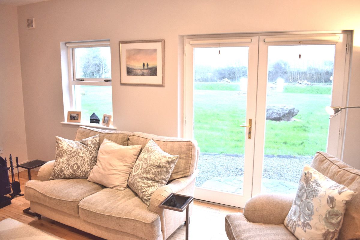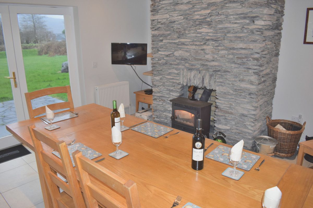 Large double glass doors look out over the back garden, with views of the mountains and Lough Currane.