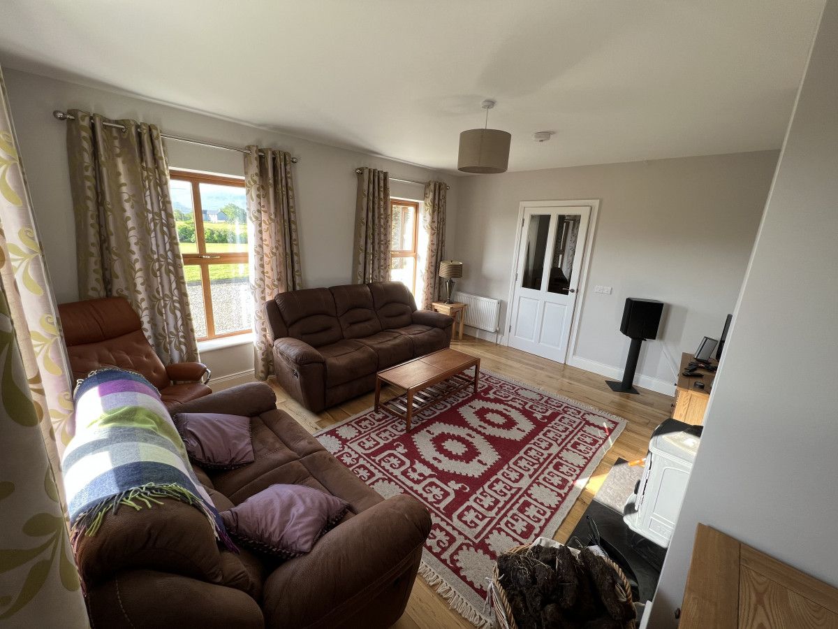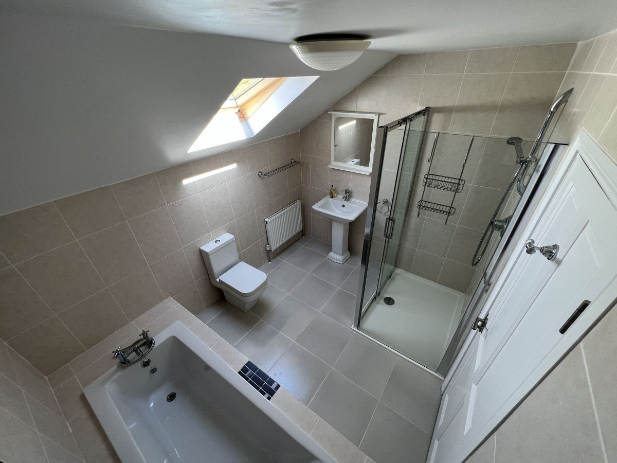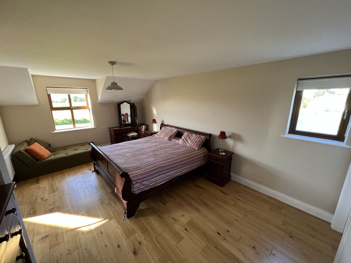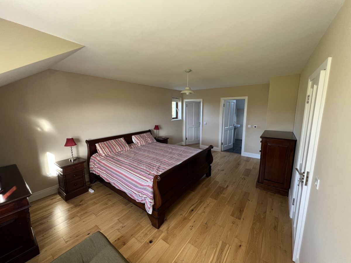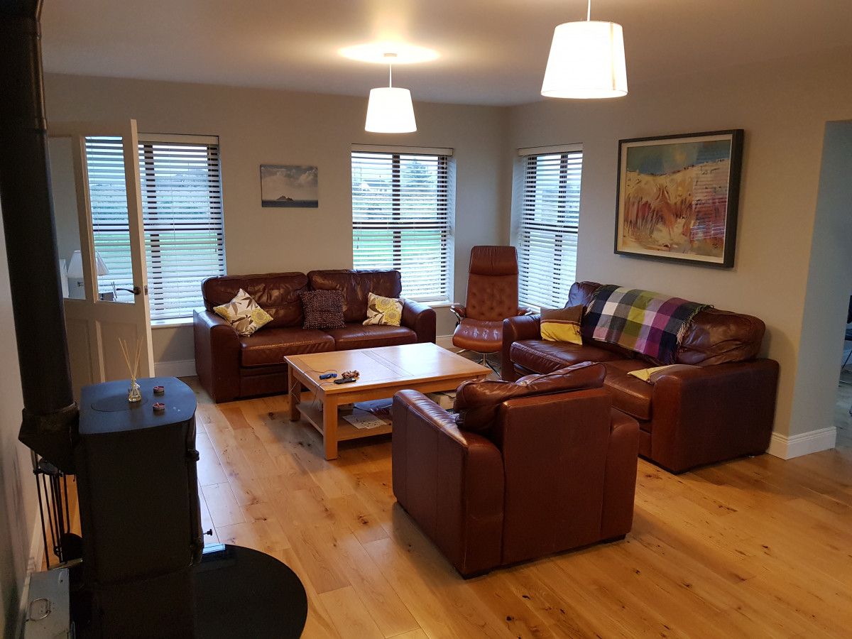 The cottage comprises 4 bedrooms, three of which have large ensuite bathrooms (WC, power shower and basin) with one additional large bathroom (WC, separate large power shower, basin and bath). There are three bedrooms upstairs and one downstairs. There is a separate sitting room with a solid fuel stove. A large kitchen is in an open plan arrangement with a living space, complete with large solid fuel stove) and conservatory dining room.