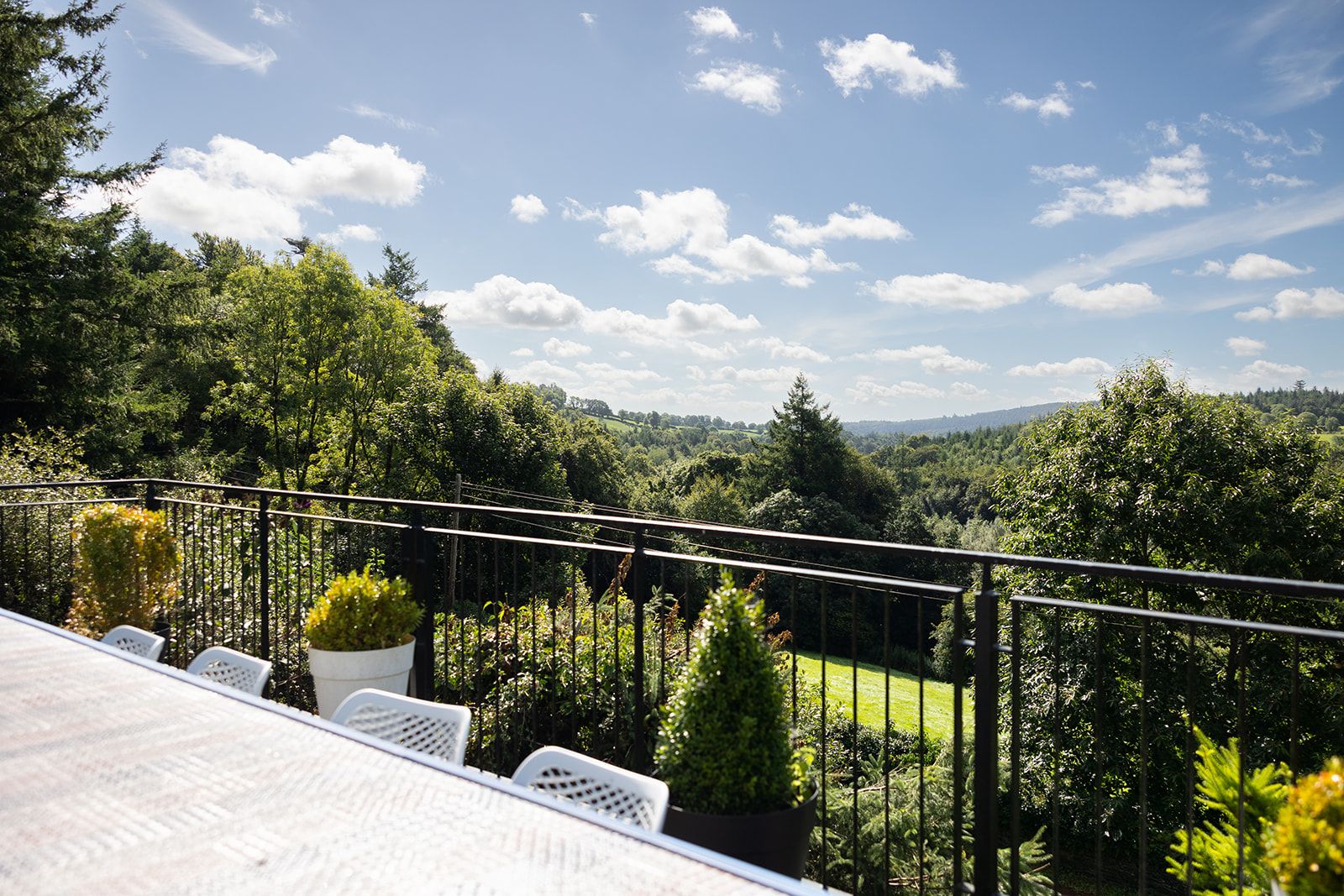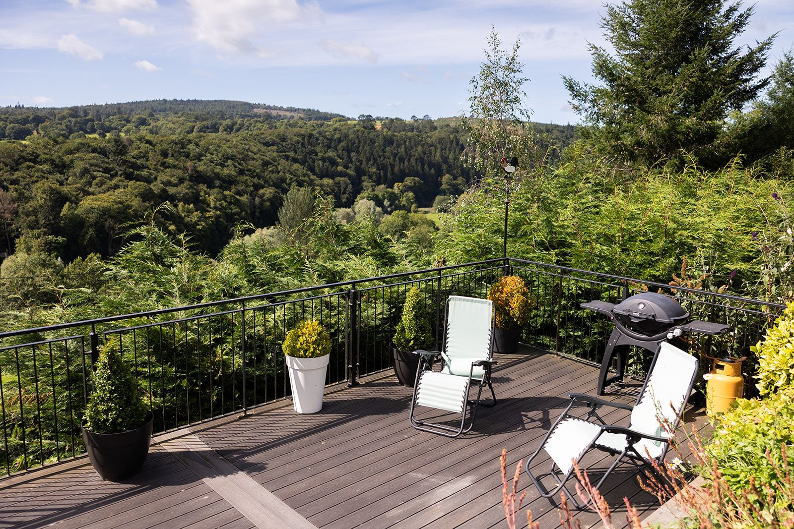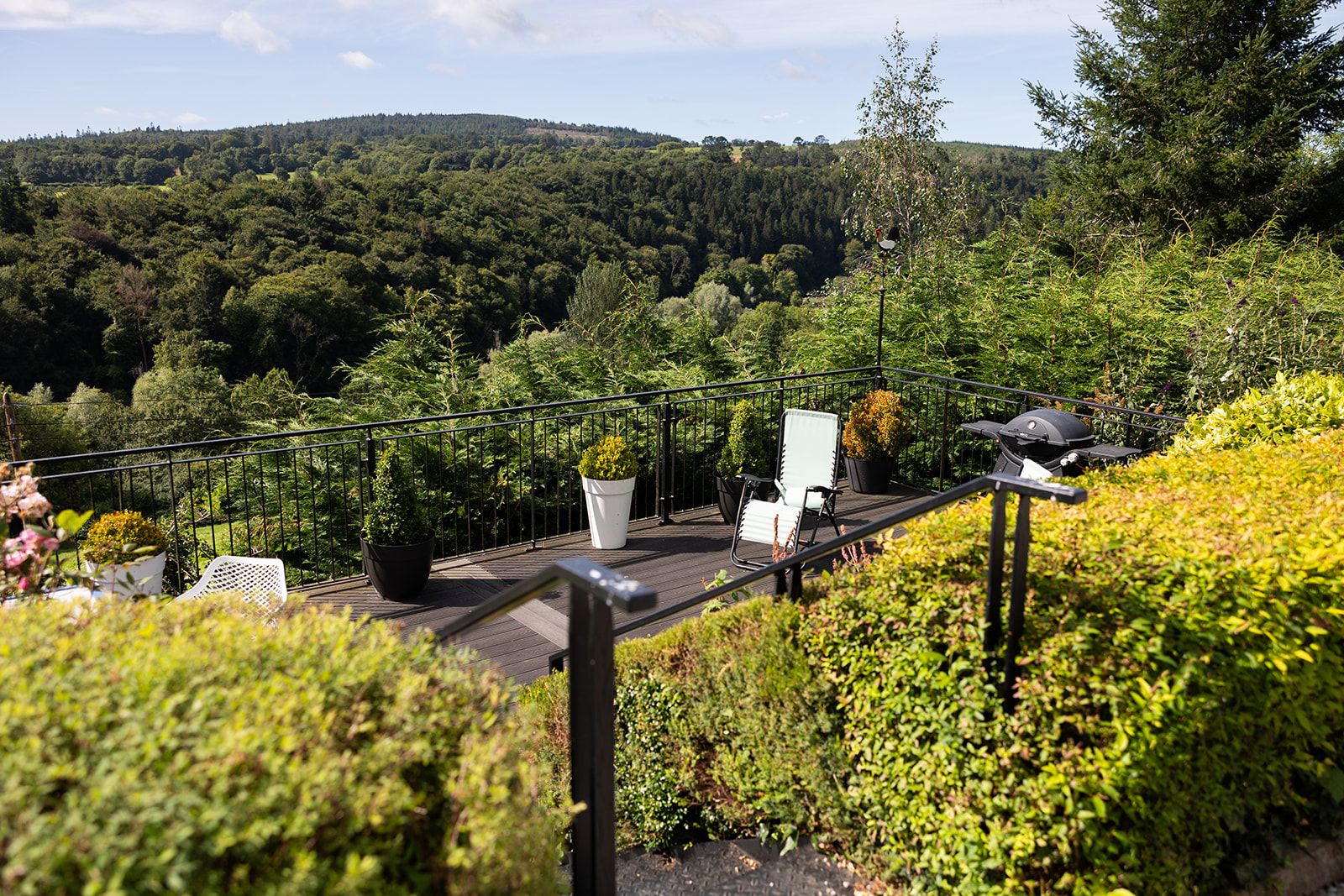 Filled with attractive shrubs, trees and flowers, the garden is a wonderful place to relax. There is an elevated decking area looking out across stunning scenery, there is a large outdoor table, lounge chairs and a BBQ.