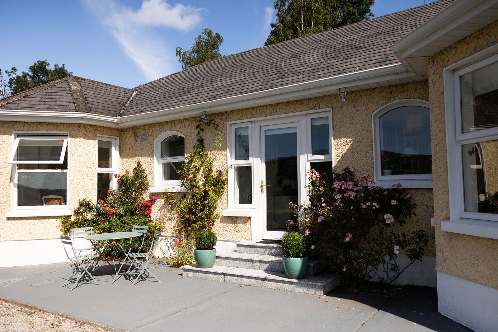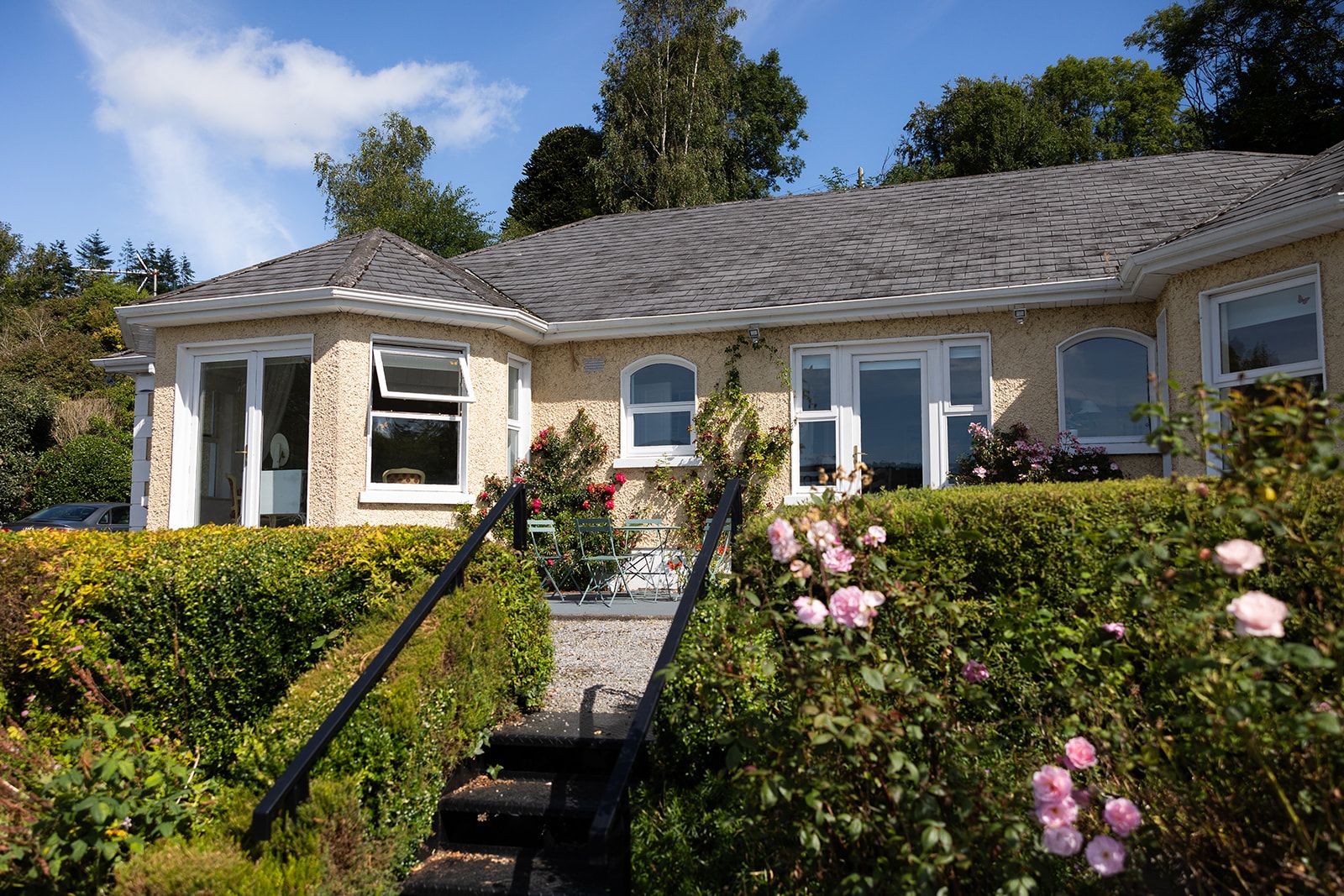 A bistro table sits near the front door and is the perfect place to have a morning coffee or an evening drink. A huge lawn area to the right of the house means there is plenty of private space for the entire family to be in comfortably.