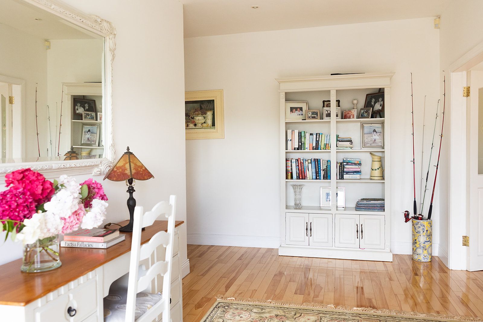 At the centre of the house is a large bright hall with a great desk to work from and shelving with books to read.