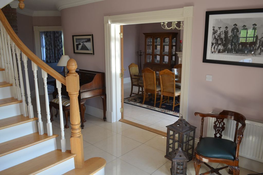 The house is tastefully decorated ,with warm fabrics and colours,.with all the modern convenience of a four star self catering property. The large entrance hall, with impressive stairs, leads to four bedrooms upstairs and one large double room downstairs. Two bedrooms are ensuite, with walk in wardrobes and a reading area.The bedrooms are furnished with king size bed ,high quality bed linen to ensure a good night sleep .