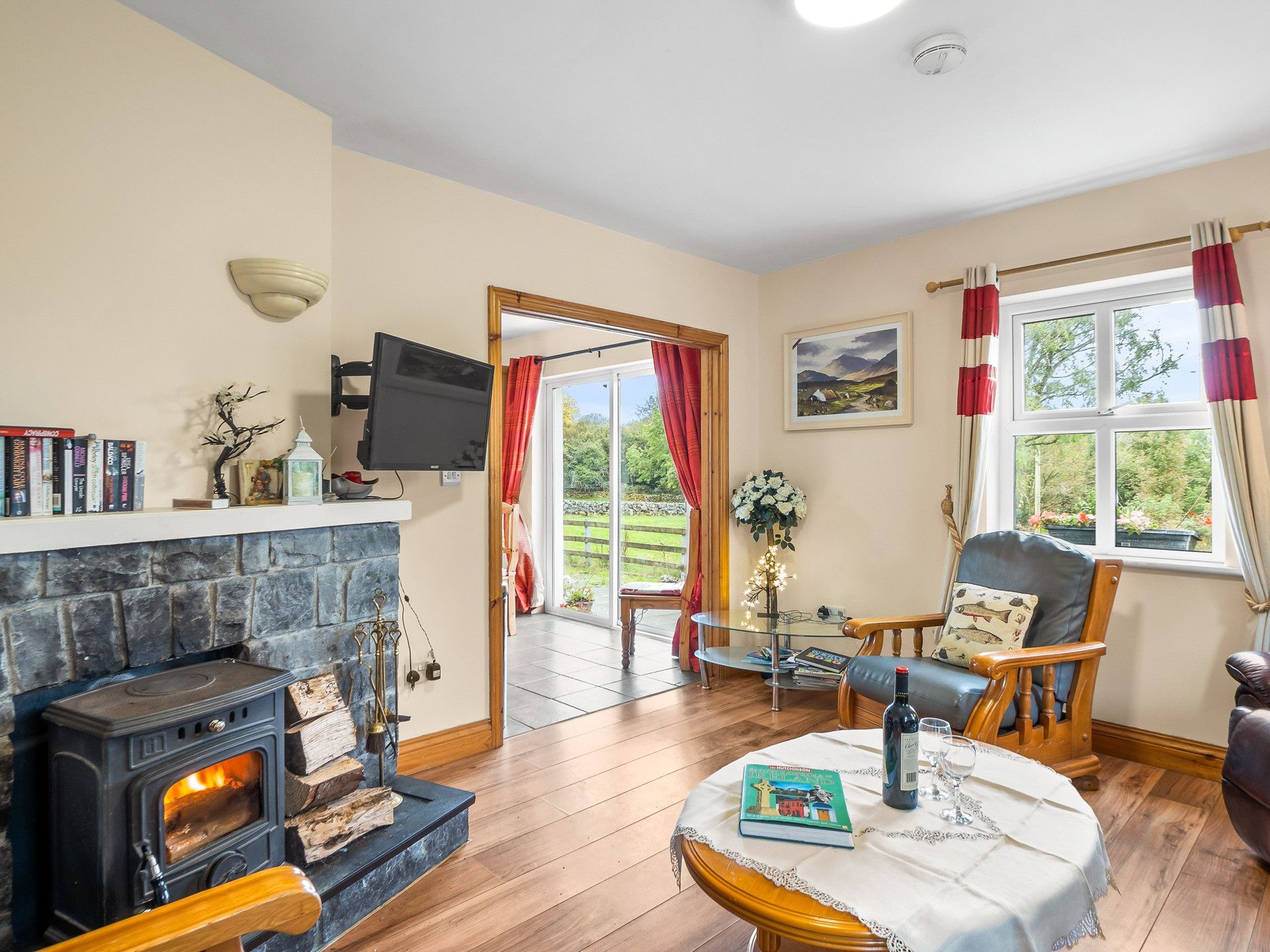 Hallway leading into a bright reception room with stove fire, comfy couches and plenty of windows overlooking green fields. There are double doors opening to the kitchen/dining area. The kitchen is fully fitted with all mod cons including washing machine, dishwasher and microwave. There is a patio door leading out onto a paved area with a picnic table with beautiful views of green fields. There is a stove fire.