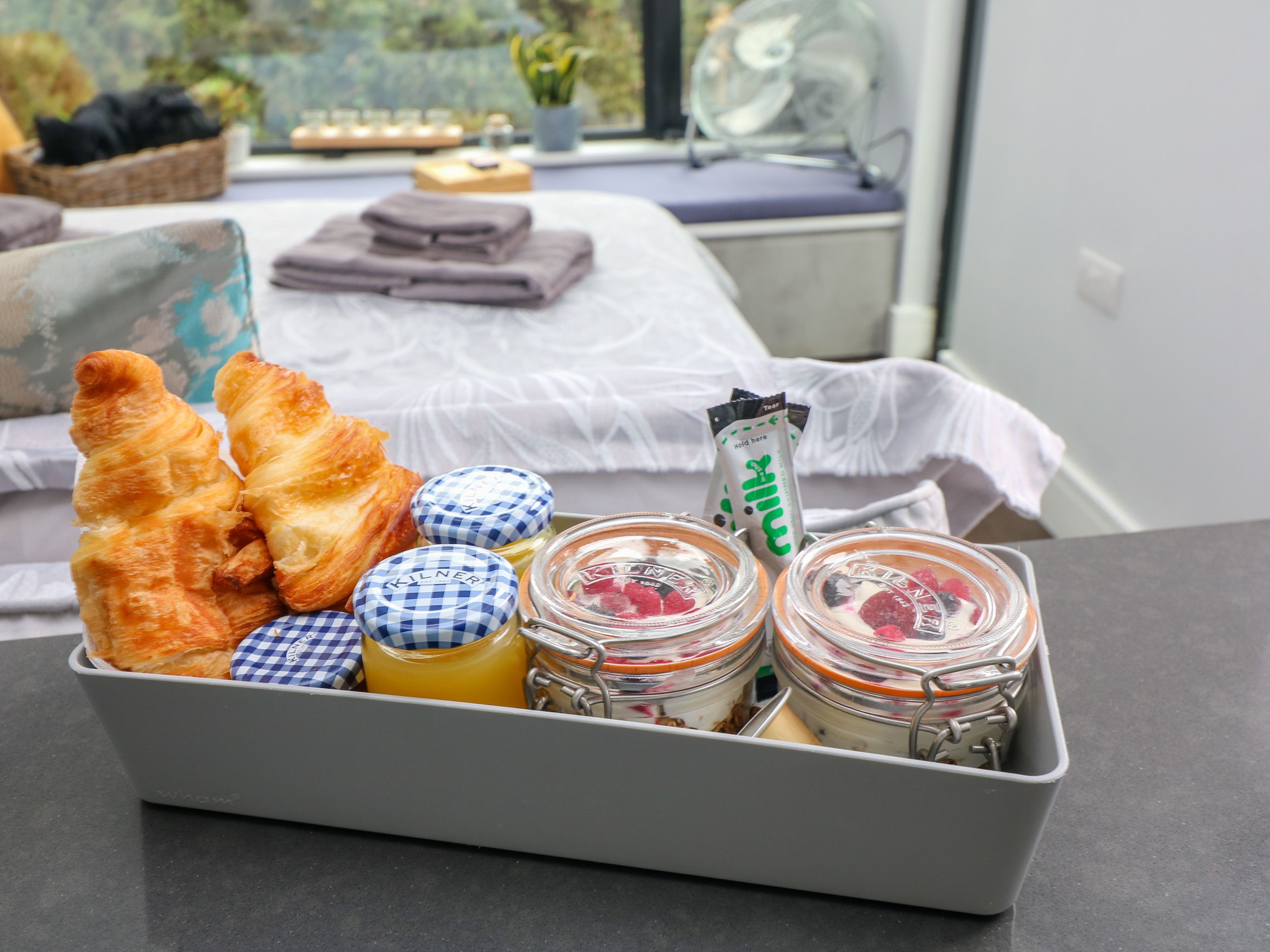 Breakfast tray delivery for 2 (croissants, granola & yoghurt, juice, coffee, jam/butter) € 14.00.