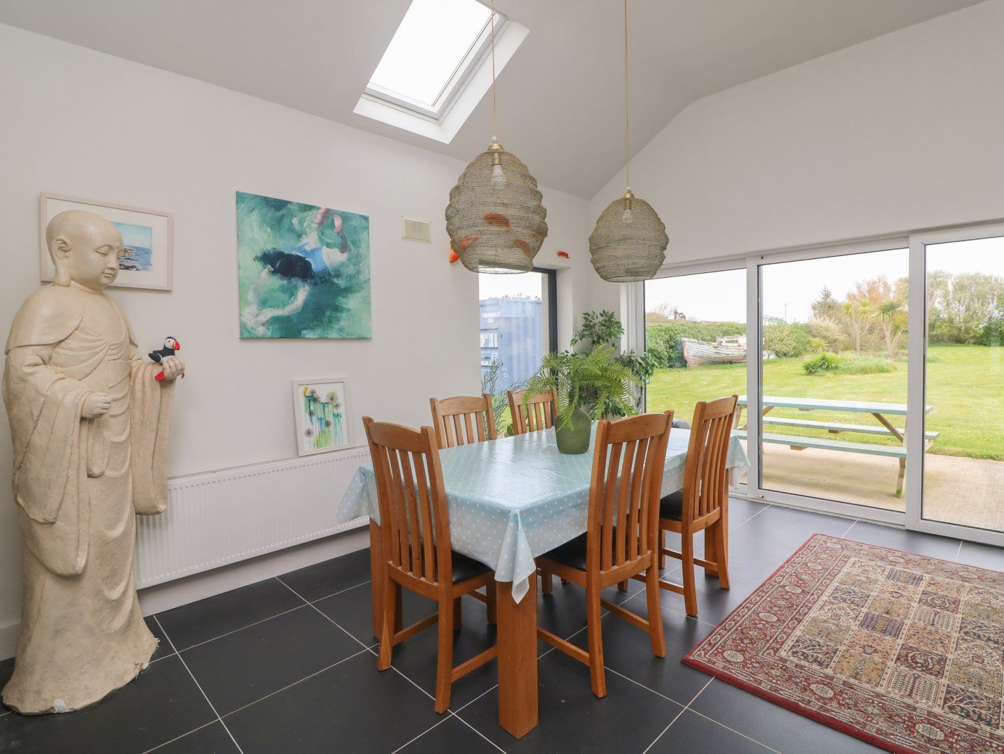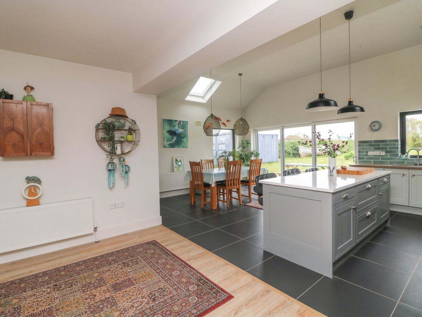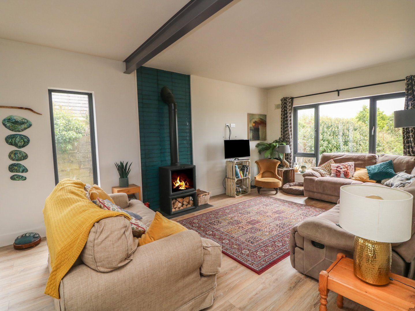 Oil-fired central heating. Electric oven and gas hob, American-style fridge/freezer, washer/dryer, dishwasher. WiFi. Fuel, power, a starter pack for woodburning stove, bed linen, and towels inc. rent. Highchair and travel cot available on request. Private parking for 5 cars. Enclosed front and rear gardens with lawn, gravel, and decking areas. Two well-behaved dogs welcome. Sorry, no smoking. Shop 1.1 miles, pub 0.9 miles, beach 0.5 miles. Note: There are steep internal stairs, please take care. Note: There is an old boat in the garden; please supervise children at all times due to possible hazards