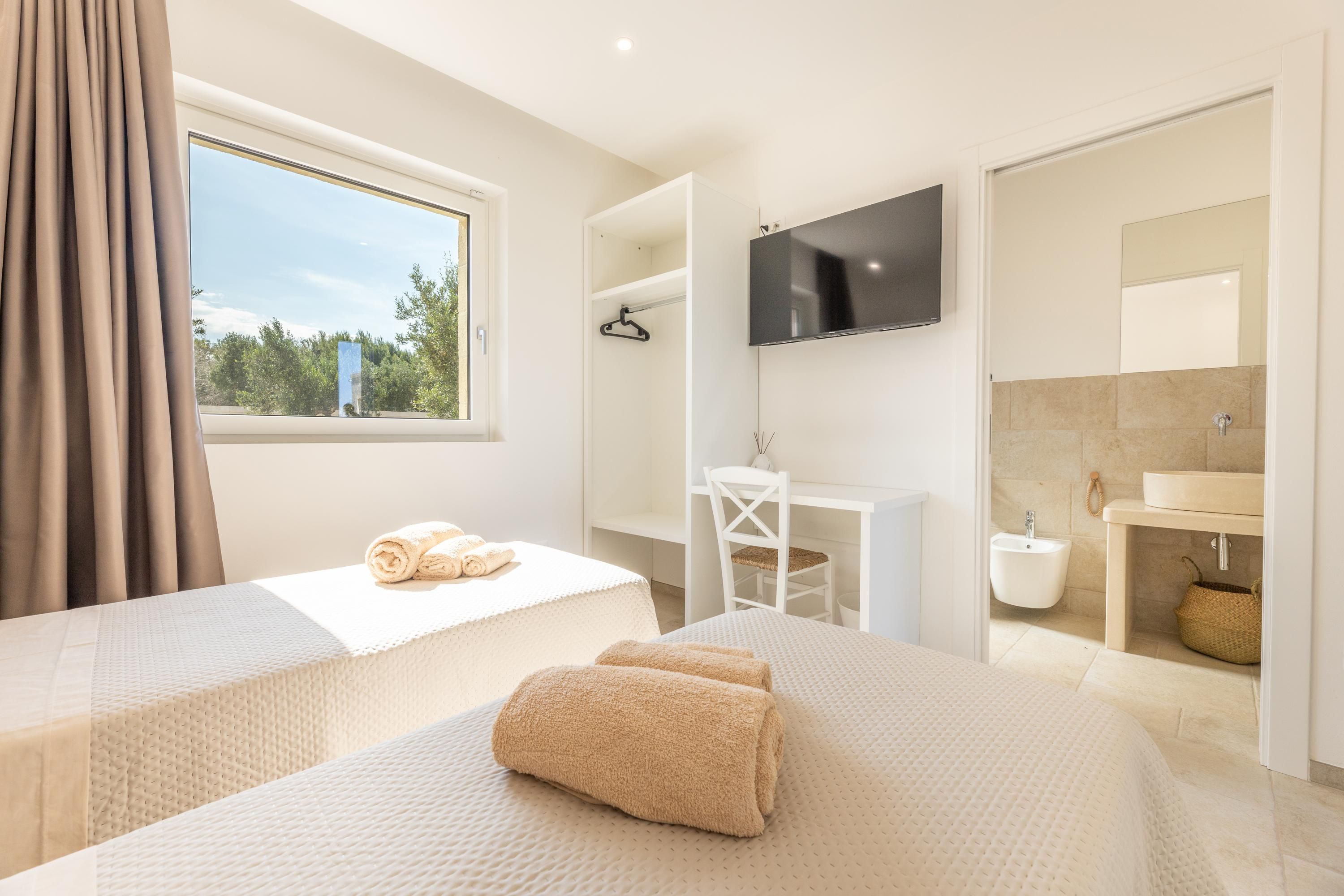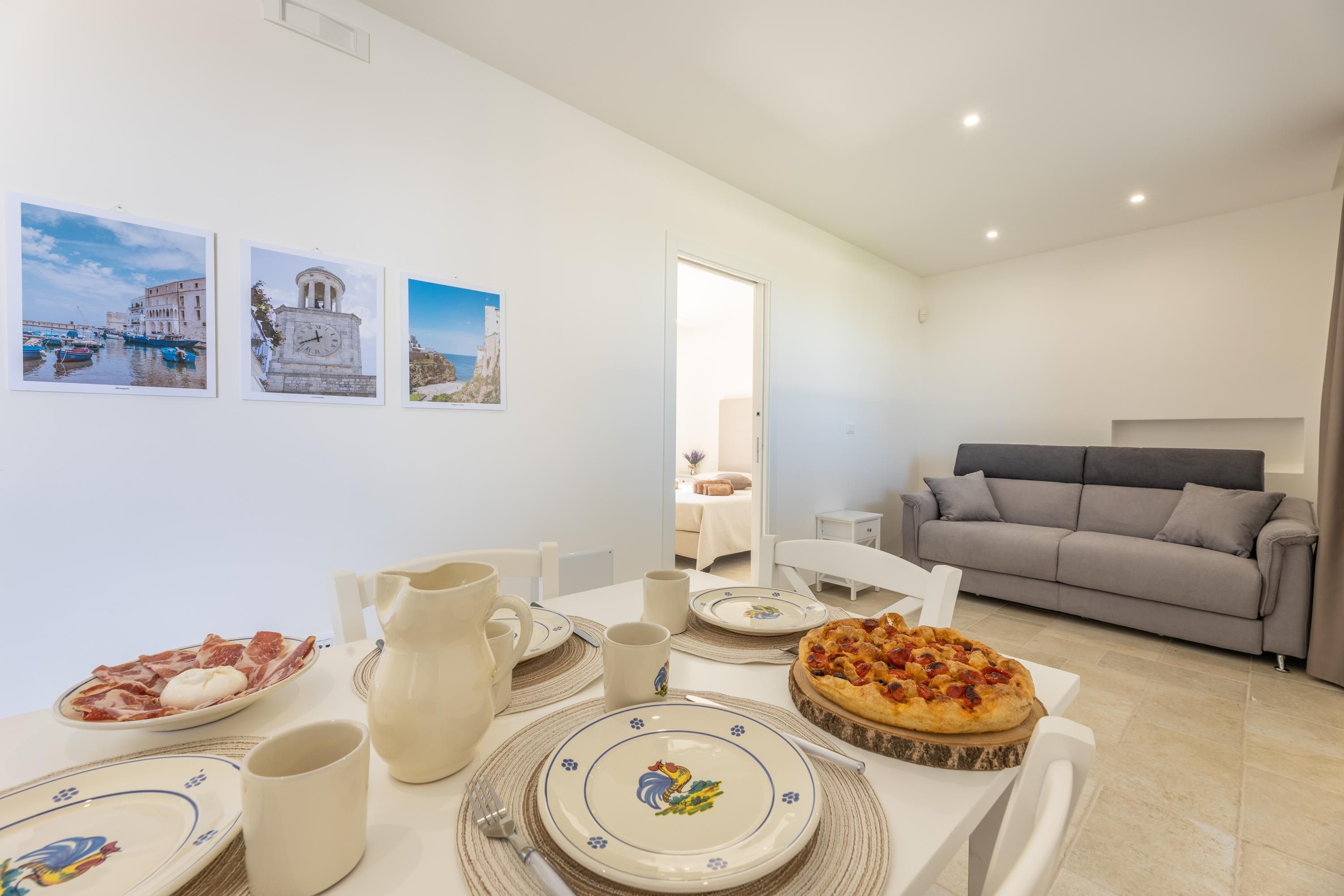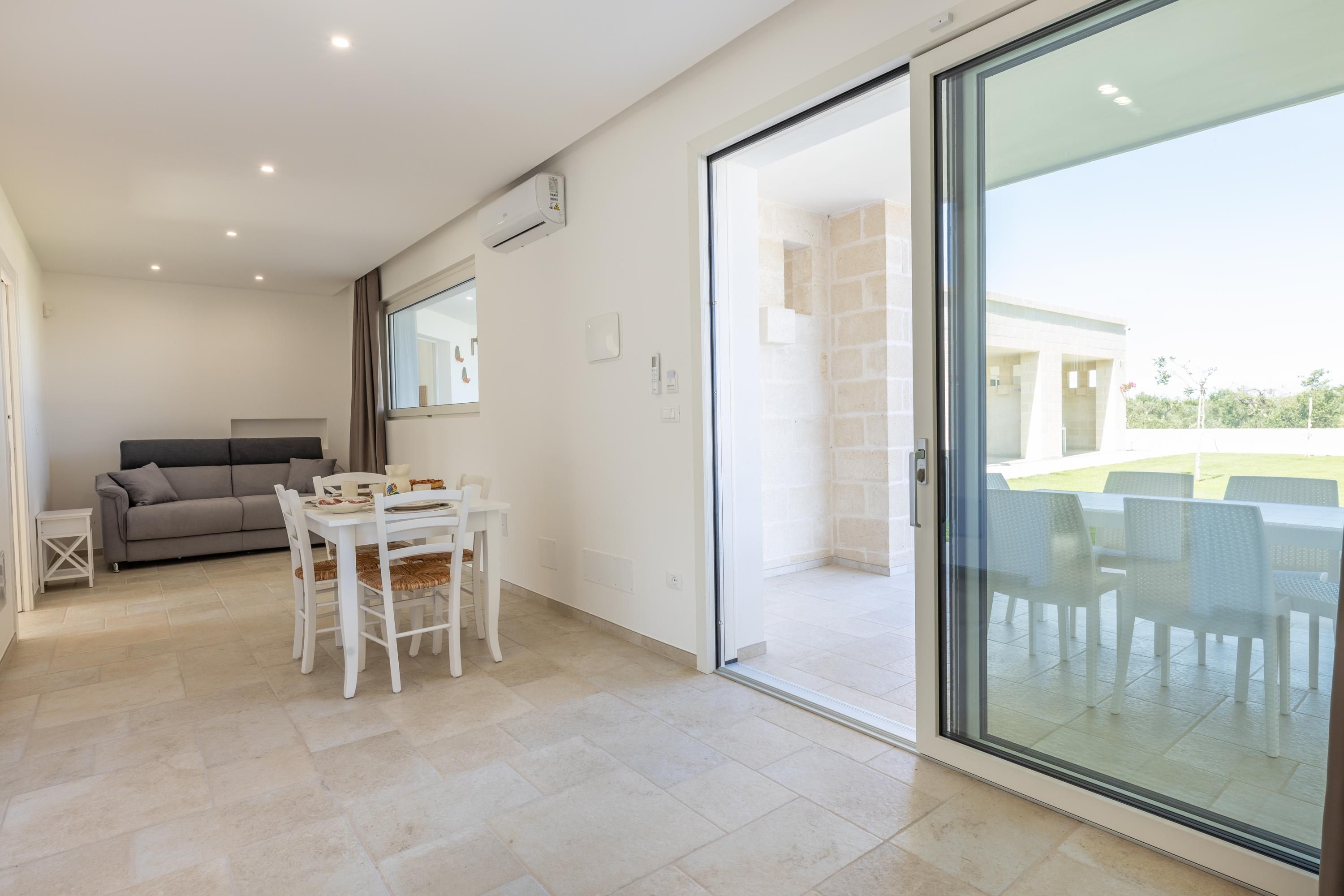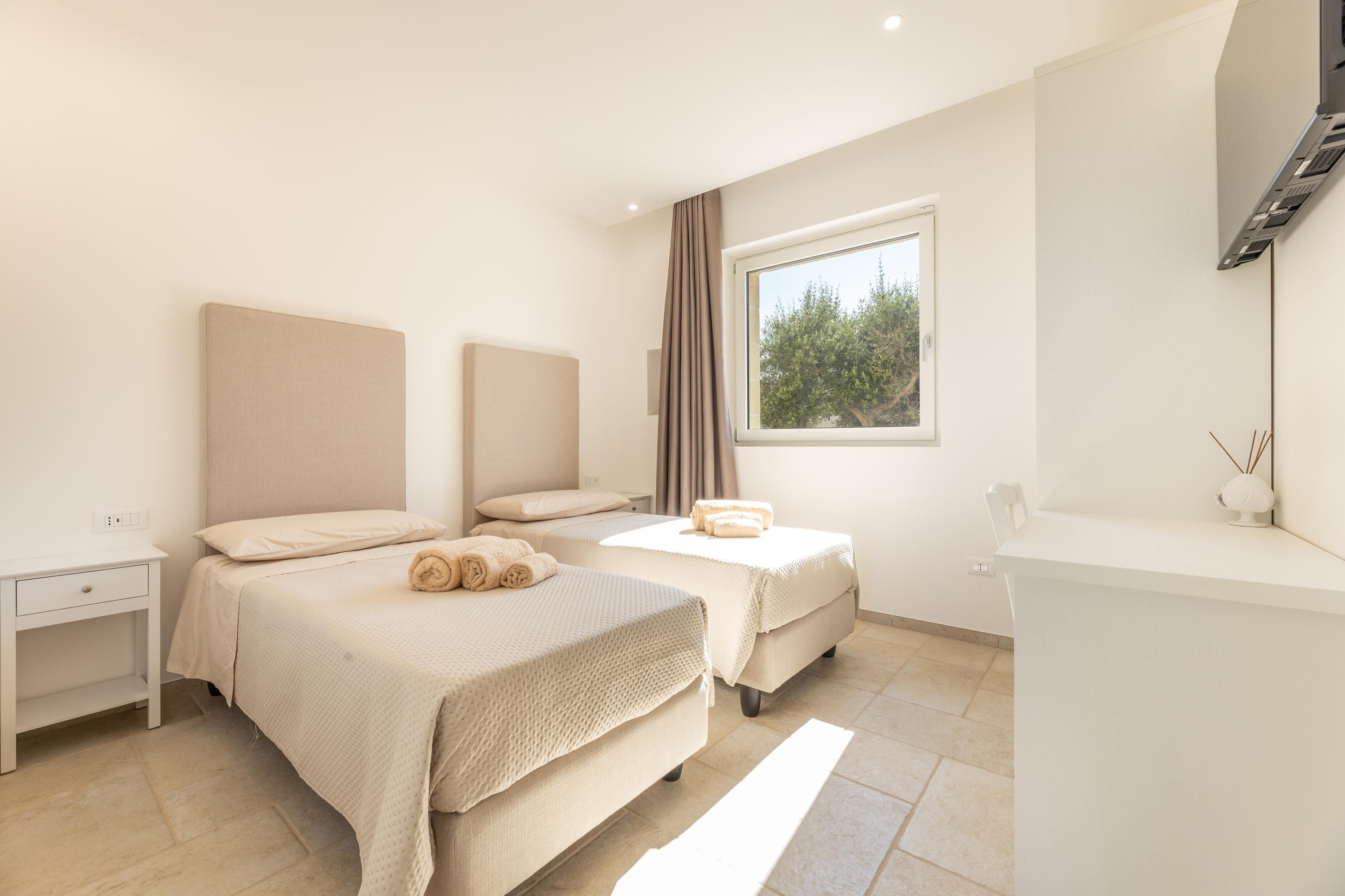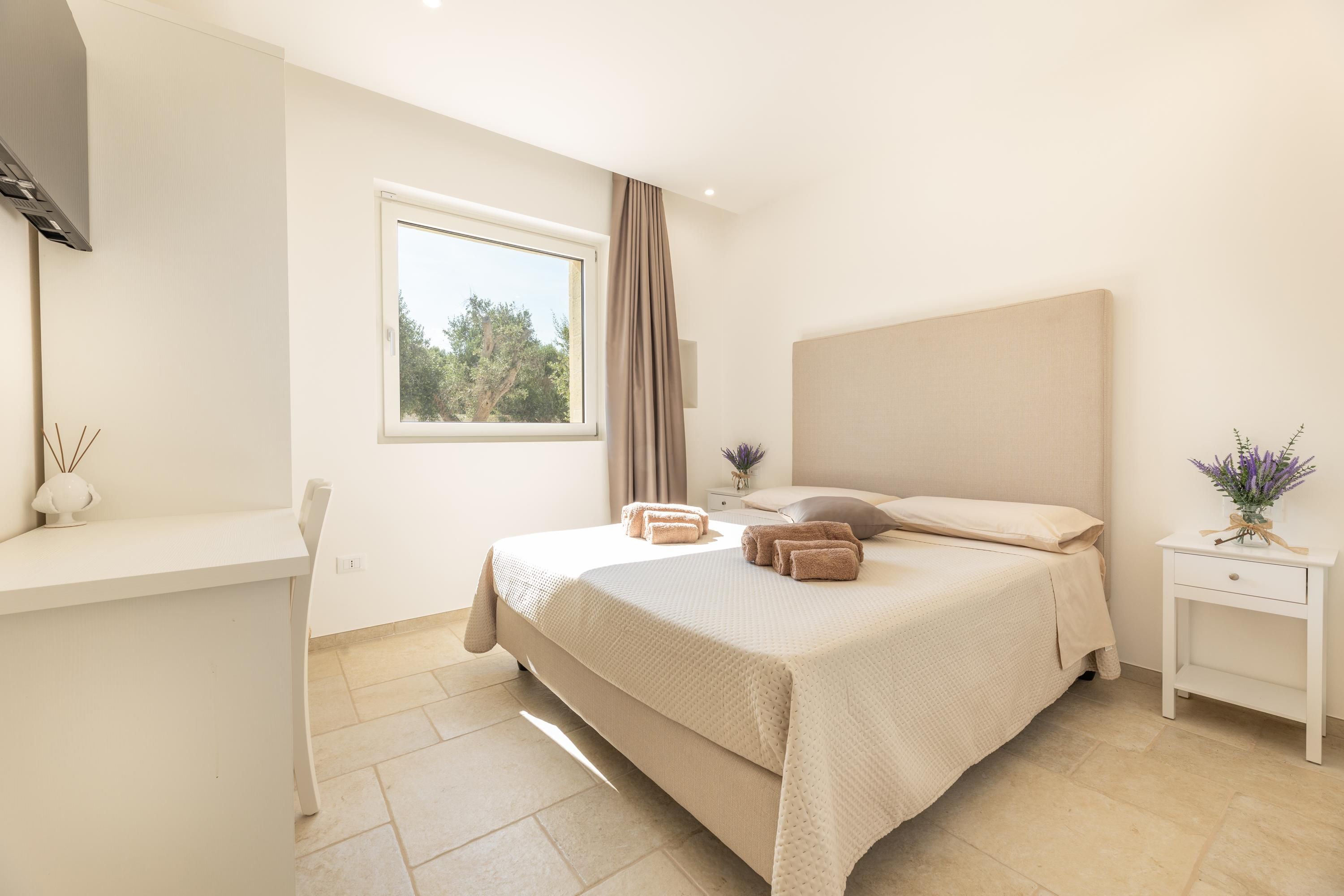 Set among centuries-old olive trees in the Carovigno countryside, this apartment makes a great base for exploring Apulia. Sliding doors open from the living area to your own section of patio for alfresco meals, and you’ll also have access to the shared garden and pool. The interiors are simple, and the kitchen is best suited to preparing light bites. At full capacity, two guests will share the sofa bed, so it may be a bit snug. However, hire a car and you’re just eleven minutes from Carovigno’s restaurants and seven from Spiaggia di Specchiolla beach. Plus, towns including Ostuni, Alberobello, and Locorotondo are all within easy reach.