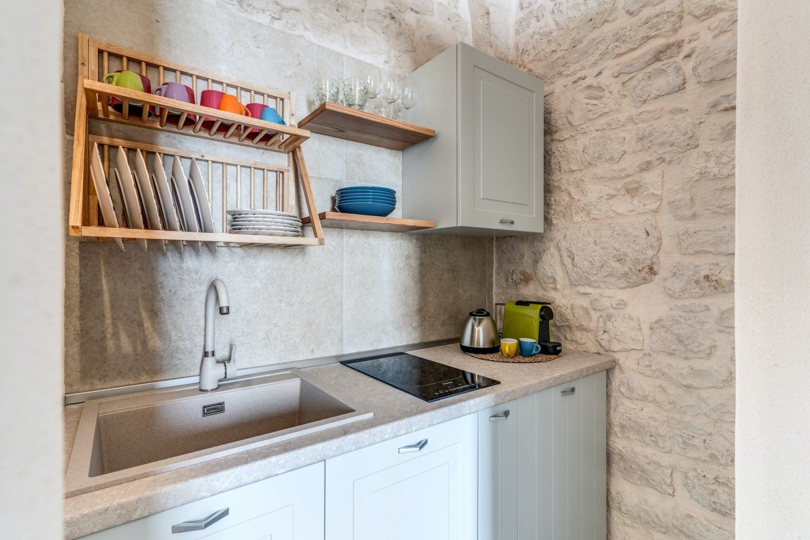 Guests rave about the location of this pocket-sized studio apartment in the historic heart of Ceglie Messapica. Set less than one hundred metres from the town's pedestrianised hub with bustling restaurants and bars, it's easy to see why. The apartment's small balcony and beautifully restored period features are a nice touch. It's worth noting the kitchenette is compact and better suited to breakfasts and light bites. However, there are no compromises to make in the bathroom with a large chronotherapy shower – perfect for cooling off after days exploring Puglia's nearby coast.