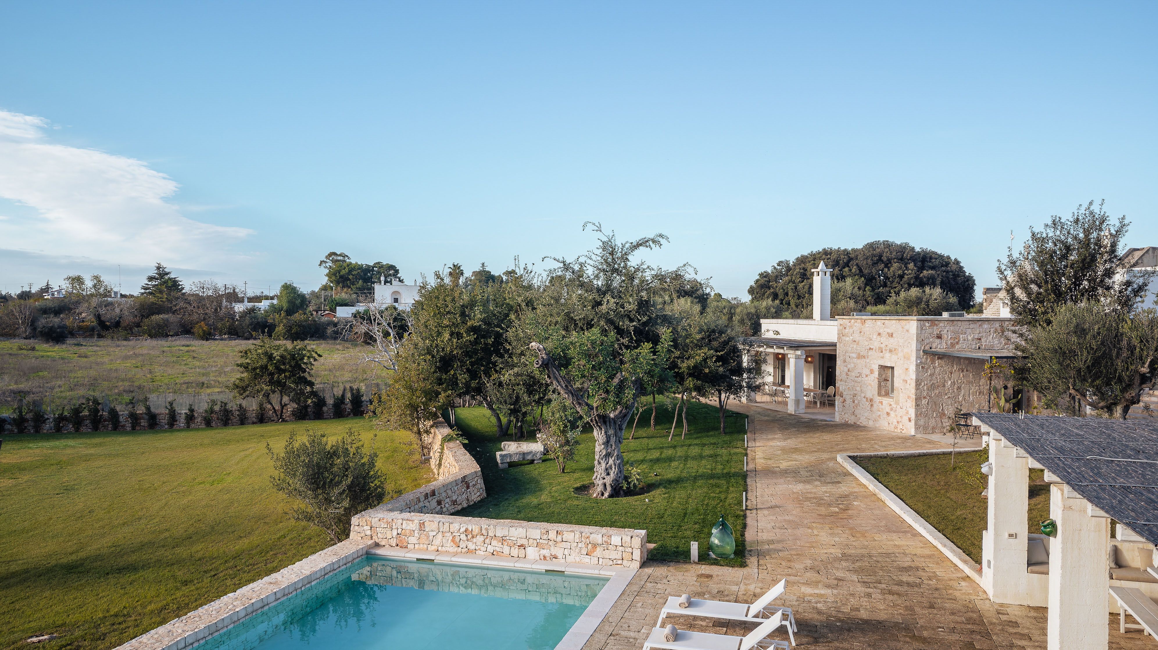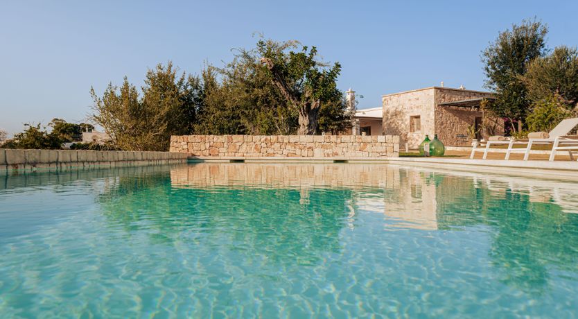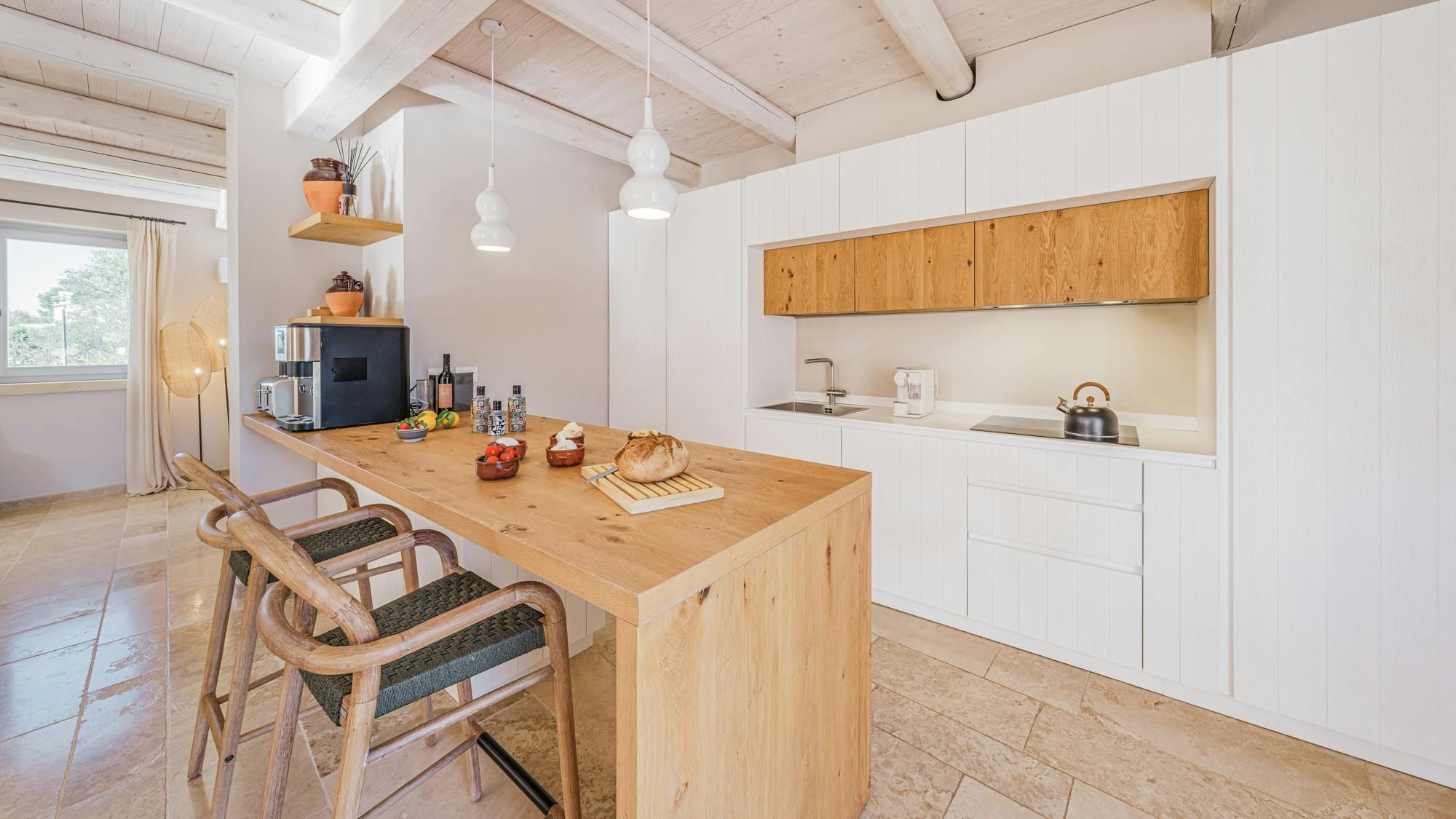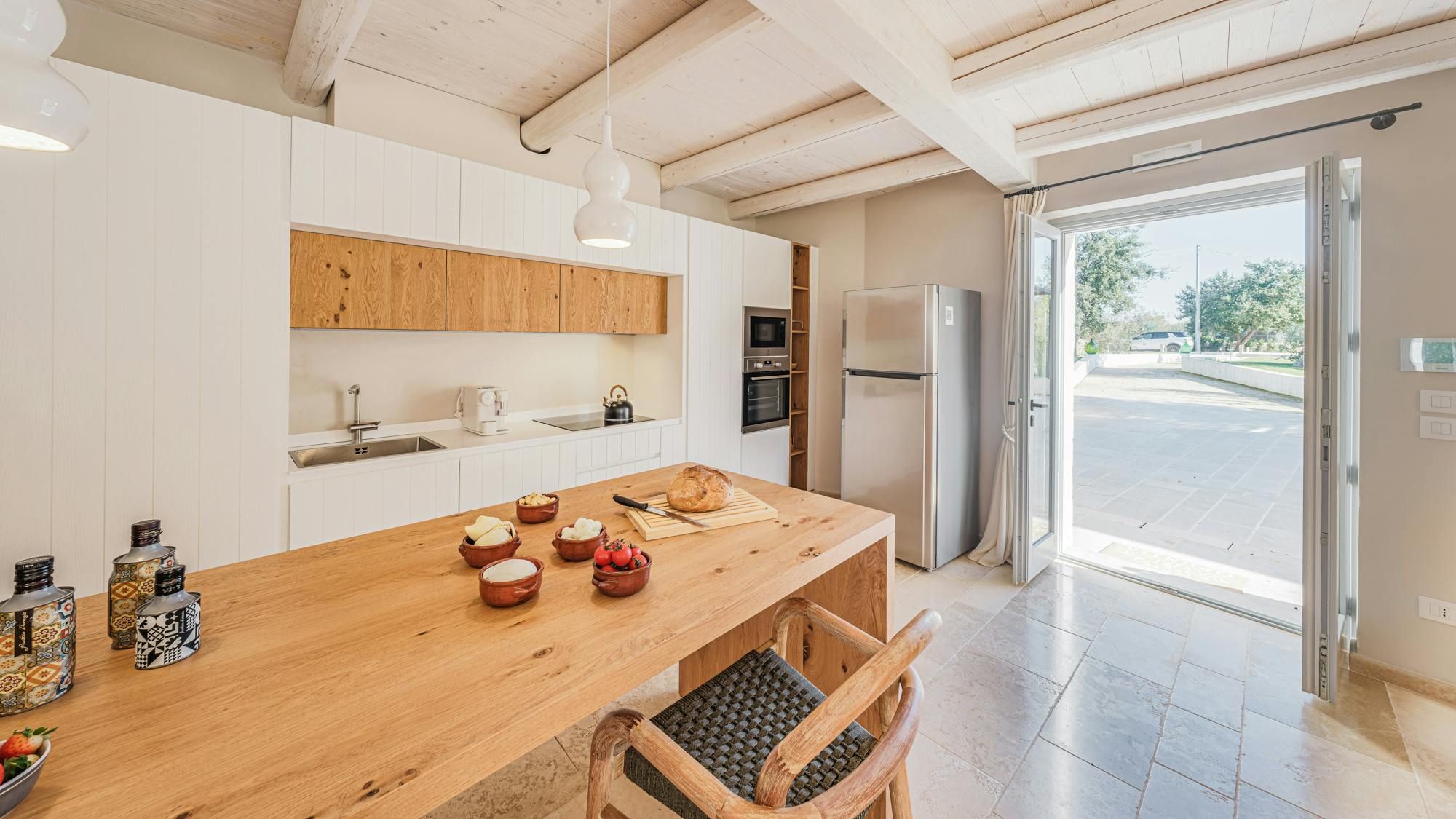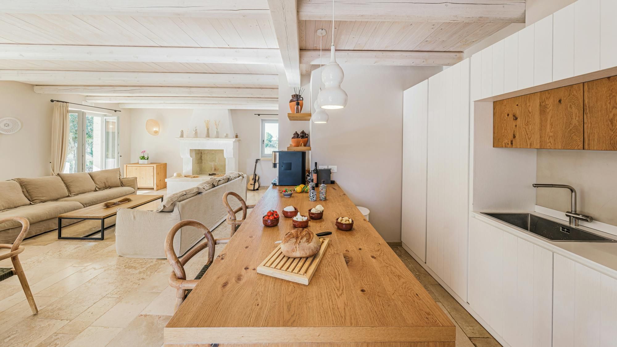 A magnificent base for an Italian escape, this beautiful home has it all. It’s close to the beaches of Polignano a Mare in the picturesque Apulian countryside, surrounded by lawns and lush vegetation, including citrus and olive trees. The outside space includes a salt-water swimming pool and an orange grove atmospherically lit in the evening. There’s also a gazebo and barbecue for alfresco dining. Thanks to a thorough restoration, the villa preserves its authentic historic charm while incorporating modern amenities and style – this is an attractive, chic home. We love the use of natural stone and wood, particularly in the open-plan living and dining space.