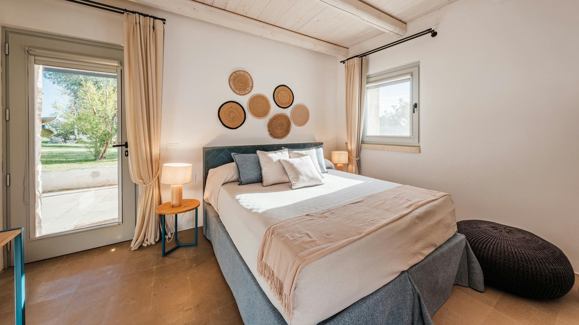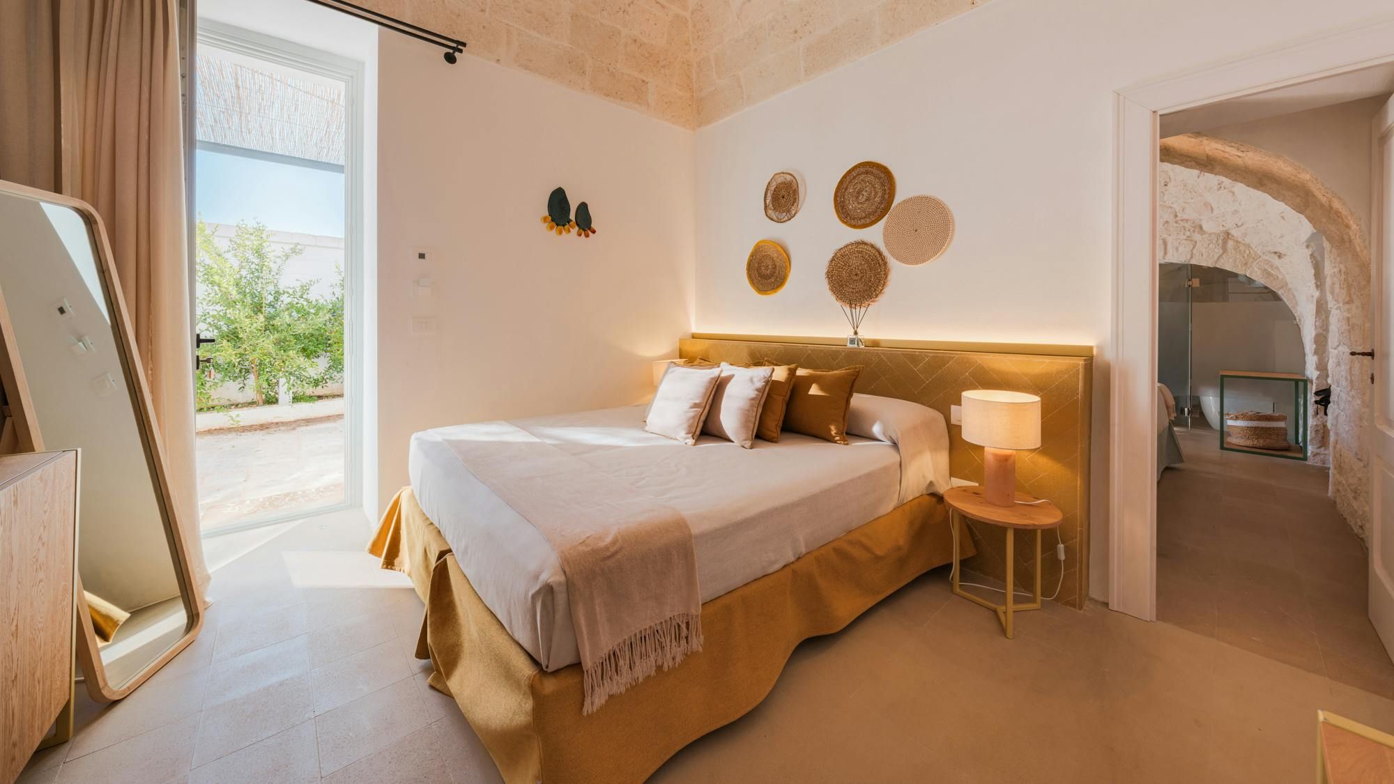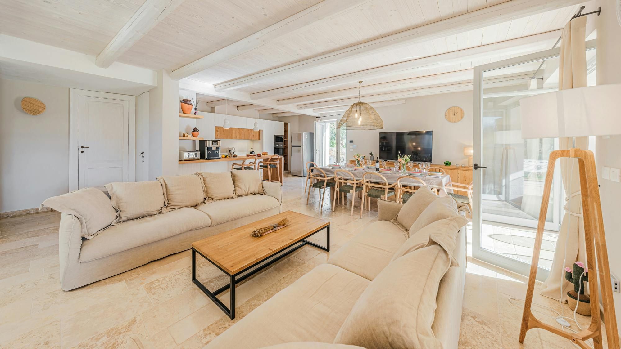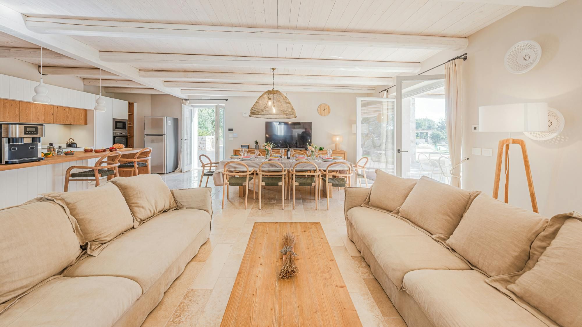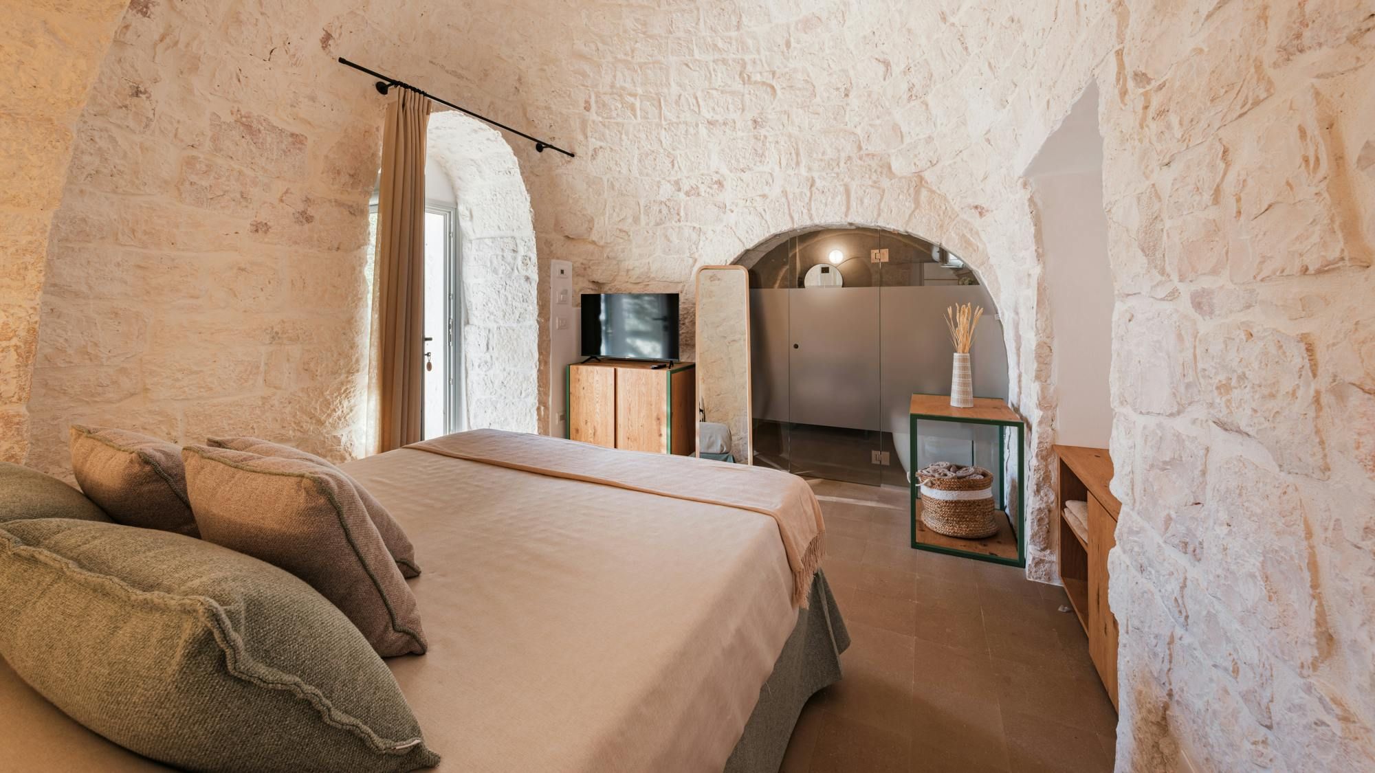 A magnificent base for an Italian escape, this beautiful home has it all. It’s close to the beaches of Polignano a Mare in the picturesque Apulian countryside, surrounded by lawns and lush vegetation, including citrus and olive trees. The outside space includes a salt-water swimming pool and an orange grove atmospherically lit in the evening. There’s also a gazebo and barbecue for alfresco dining. Thanks to a thorough restoration, the villa preserves its authentic historic charm while incorporating modern amenities and style – this is an attractive, chic home. We love the use of natural stone and wood, particularly in the open-plan living and dining space.