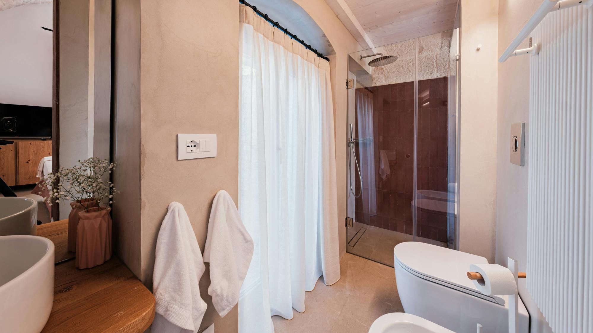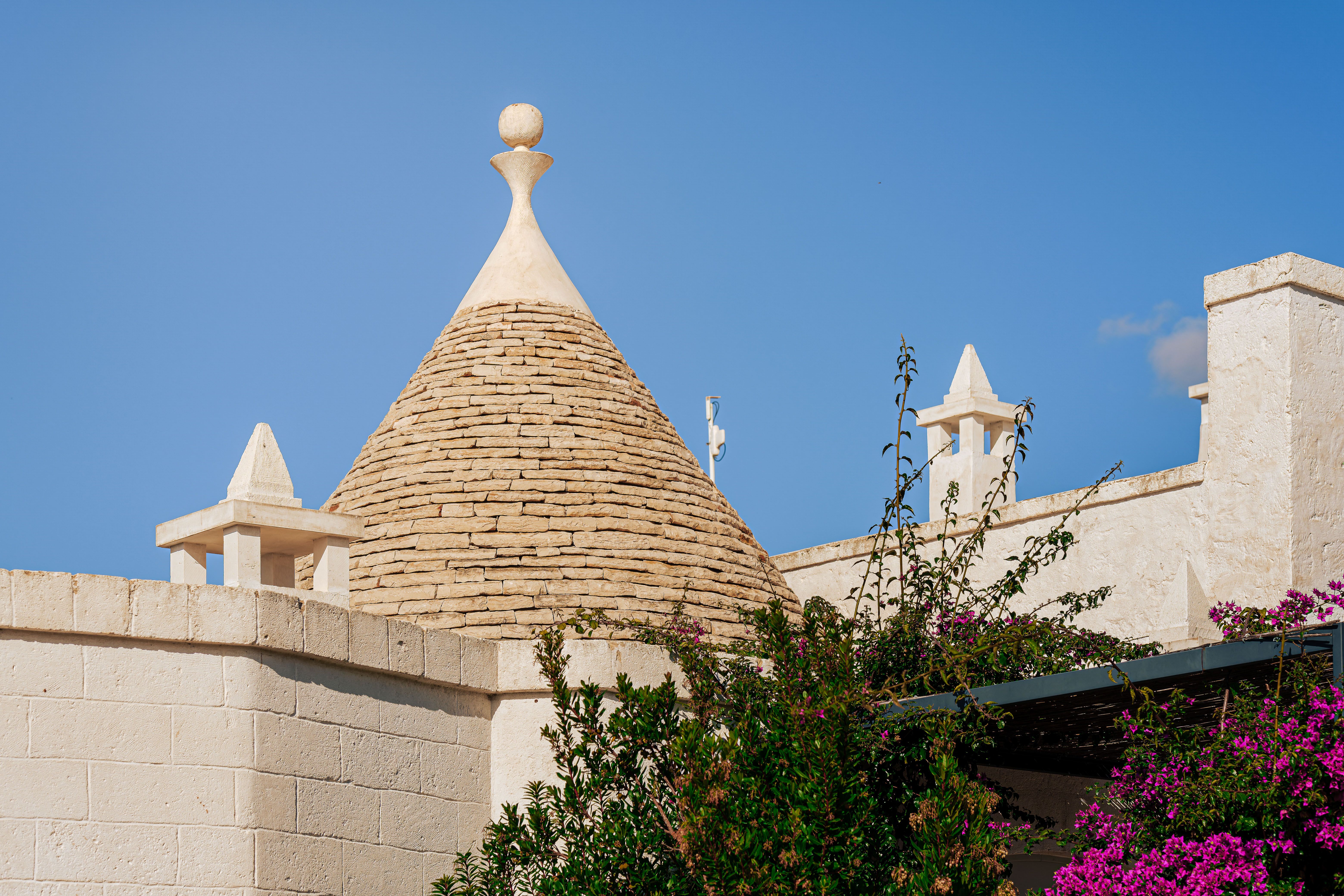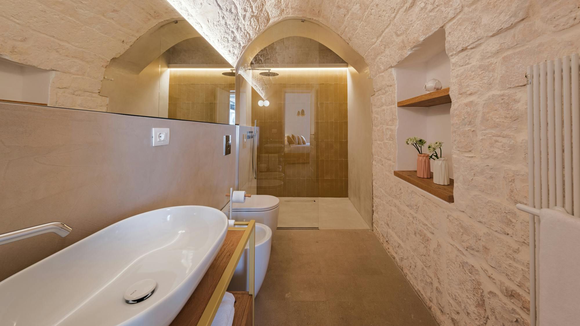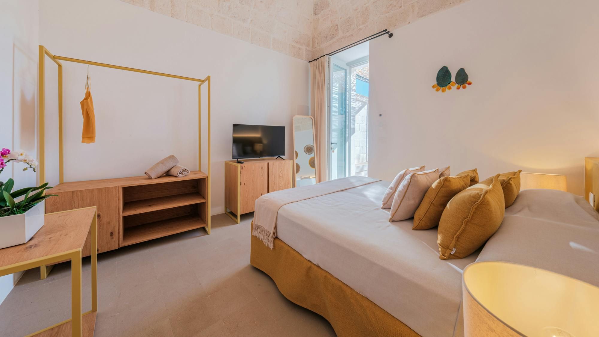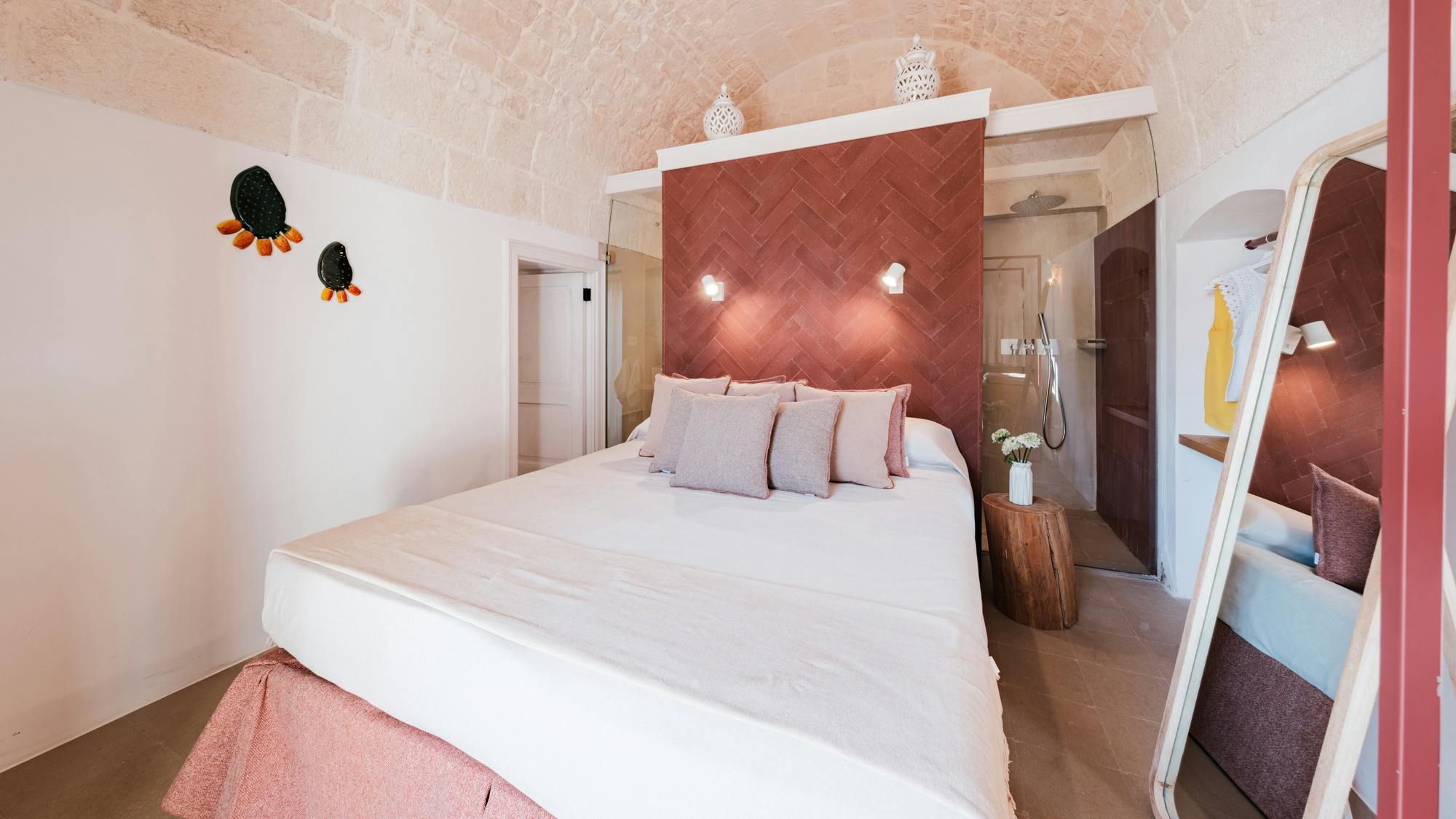 A magnificent base for an Italian escape, this beautiful home has it all. It’s close to the beaches of Polignano a Mare in the picturesque Apulian countryside, surrounded by lawns and lush vegetation, including citrus and olive trees. The outside space includes a salt-water swimming pool and an orange grove atmospherically lit in the evening. There’s also a gazebo and barbecue for alfresco dining. Thanks to a thorough restoration, the villa preserves its authentic historic charm while incorporating modern amenities and style – this is an attractive, chic home. We love the use of natural stone and wood, particularly in the open-plan living and dining space.
