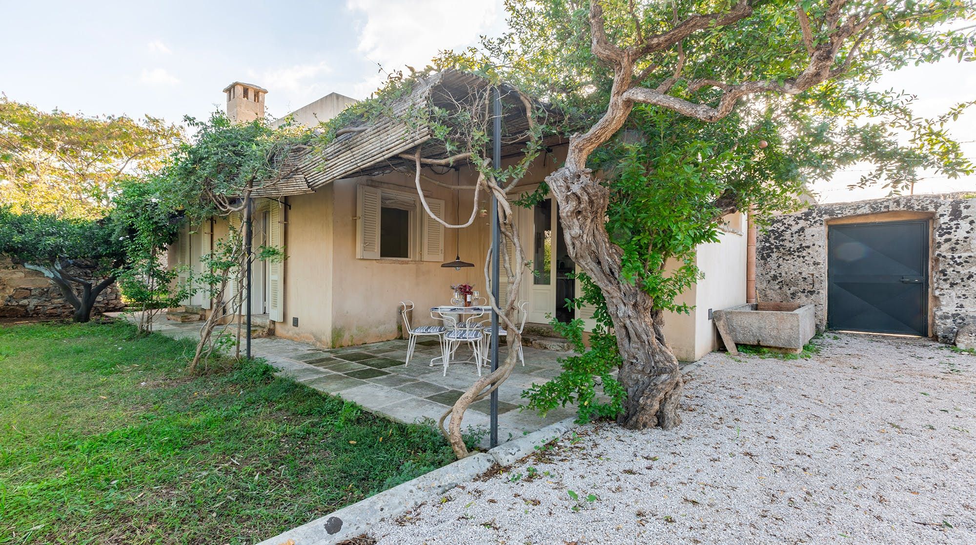 The exterior is a quintessential country farmhouse, with picture-perfect window shutters and a stone patio that beckons you to take a seat and crack open a bottle of red wine. While away the hours with good weather and good company.