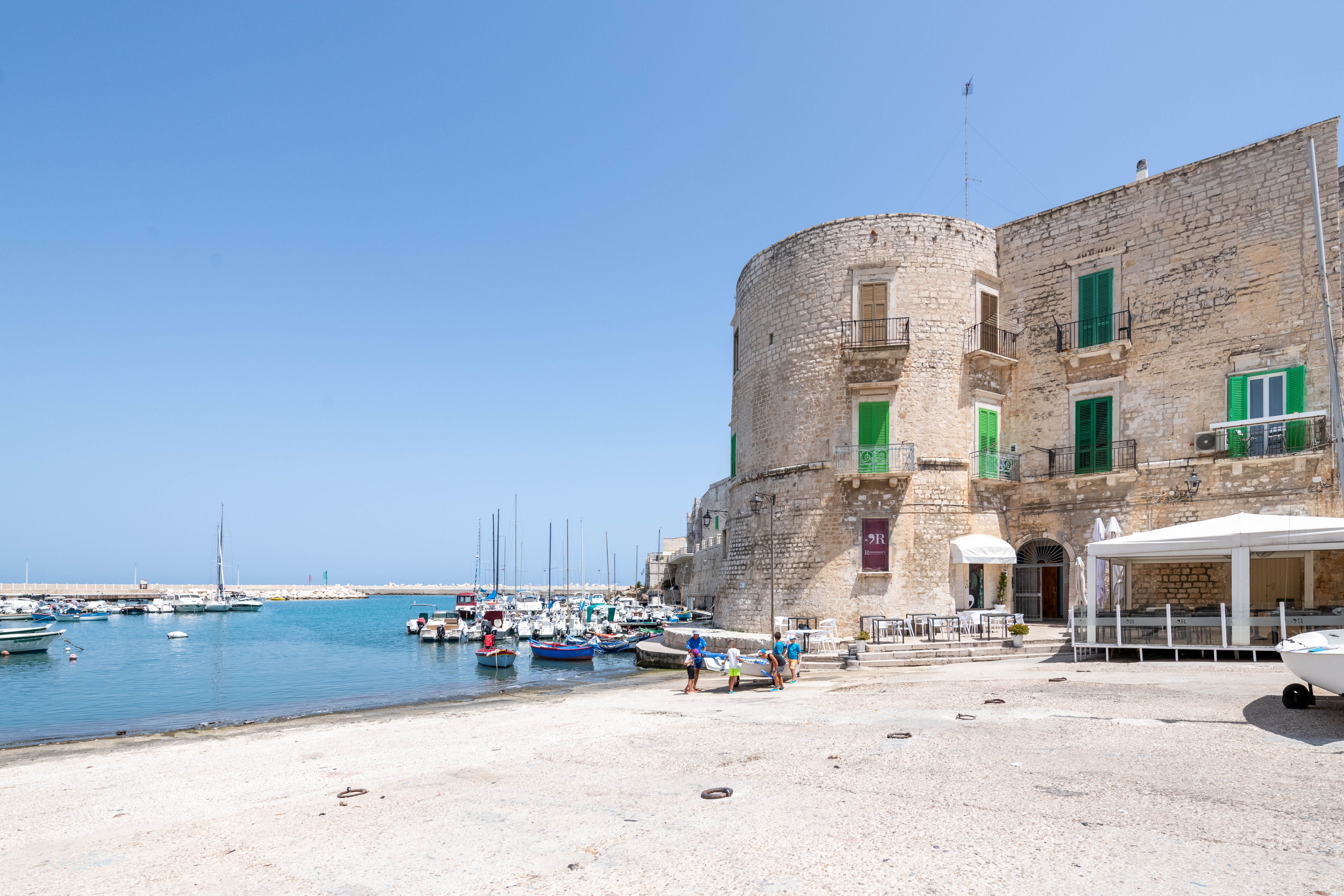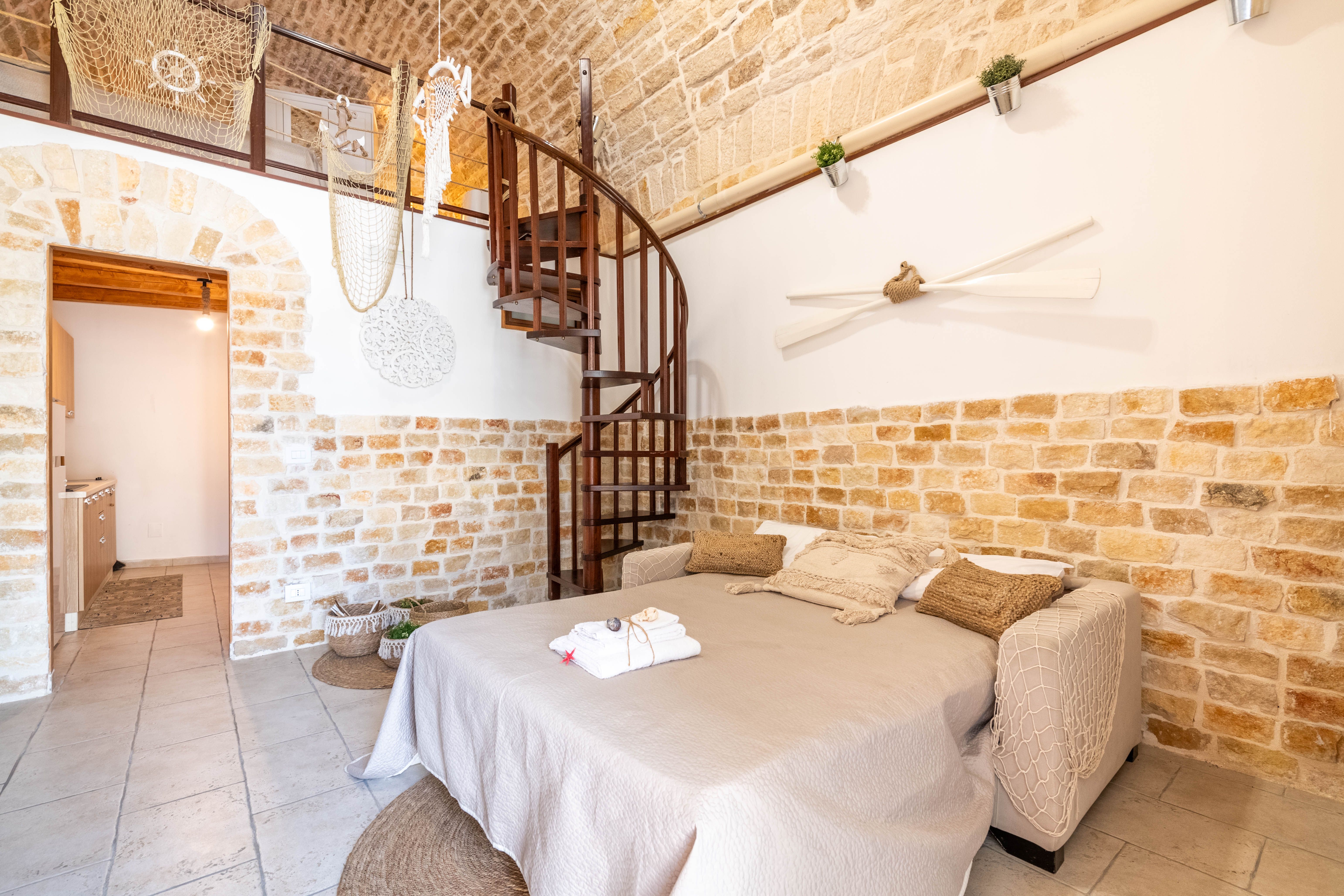 Truly a one-of-a-kind stay in Giovanazzo, this mezzanine apartment is situated within the Torrione Aragonese, a historic seaside watchtower built during the Aragonese rule of the Kingdom of Naples in the 15th century. Its features add a Renaissance-era atmosphere, blended with 21st-century comfort – including a king-sized bed, sofa bed and small kitchenette. Venture outside and you’ll find the Adriatic Sea just steps away, offering a gentle breeze while you wander Giovanazzo’s waterfront – or take a short drive to bustling Bari, Puglia’s largest city.