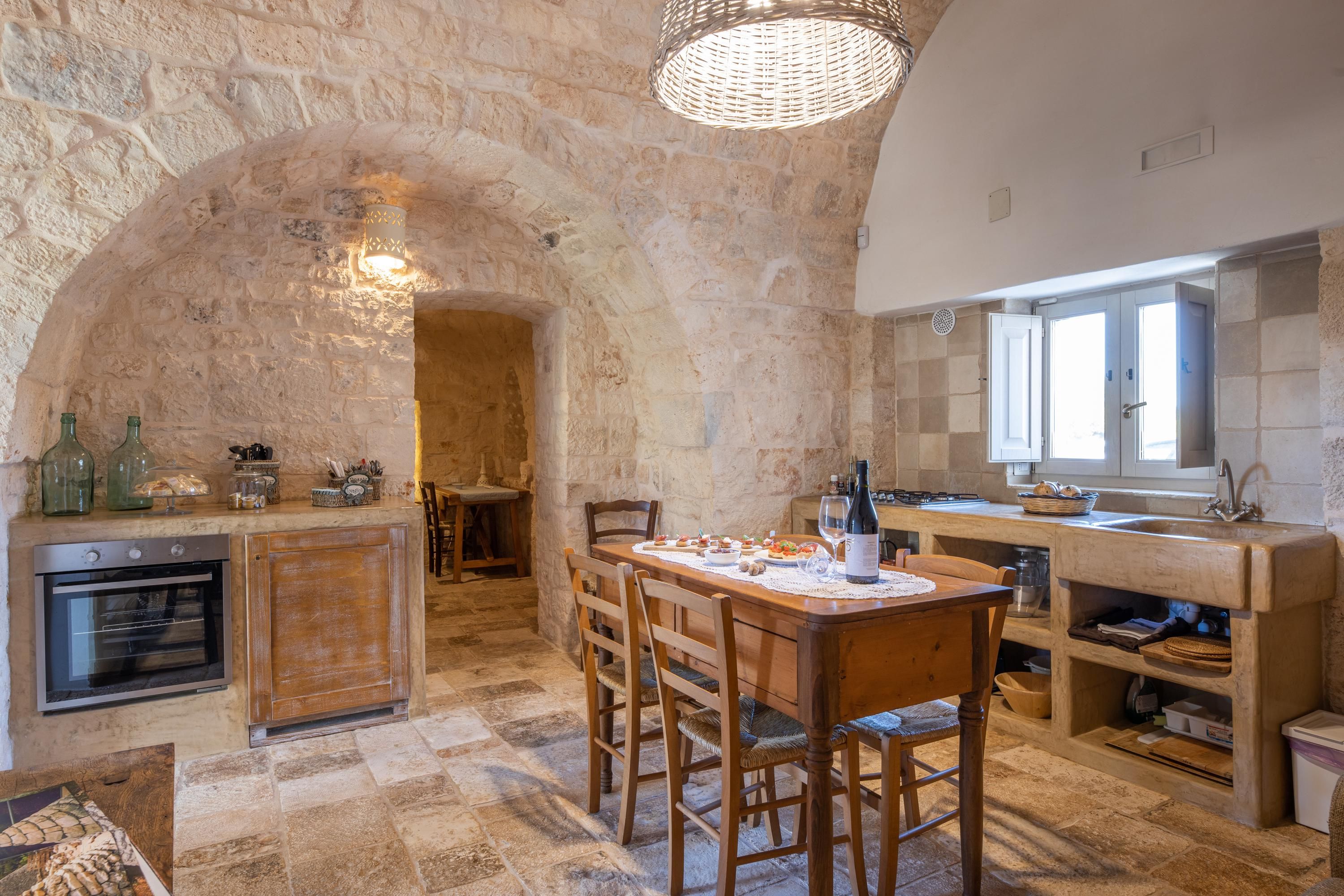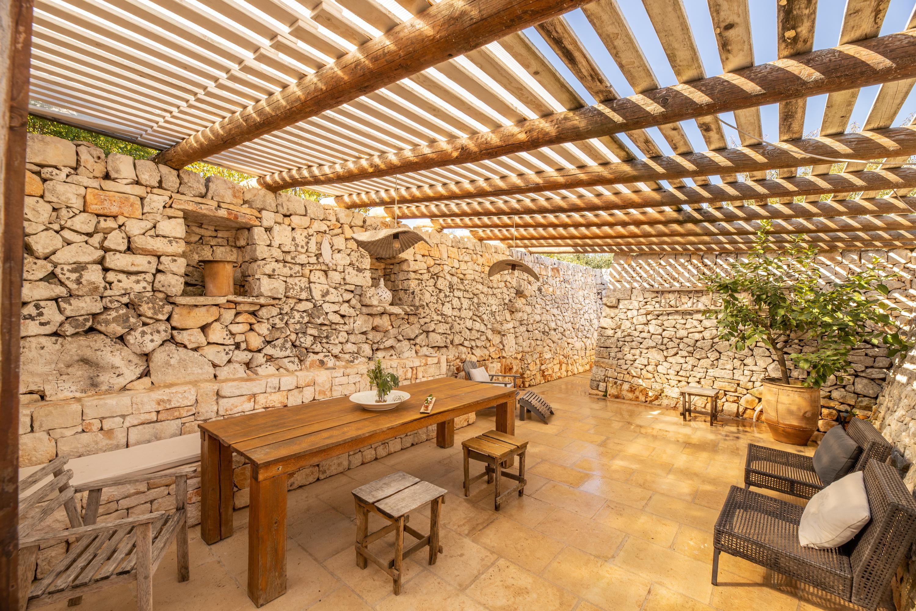 Set across a series of traditional trulli, this home is full of rustic character. The exposed limestone walls and classic conical roofs make each trullo feel like a cosy cocoon – perfect to retreat to after a day spent exploring. Step out to the garden to discover two sunny swimming pools, space to cook and eat together, and a hot tub overlooking the scenic surroundings. It’s worth noting that if twelve of you are travelling, two will sleep on sofa beds. But we think that’s a minor compromise to stay in such a special spot.